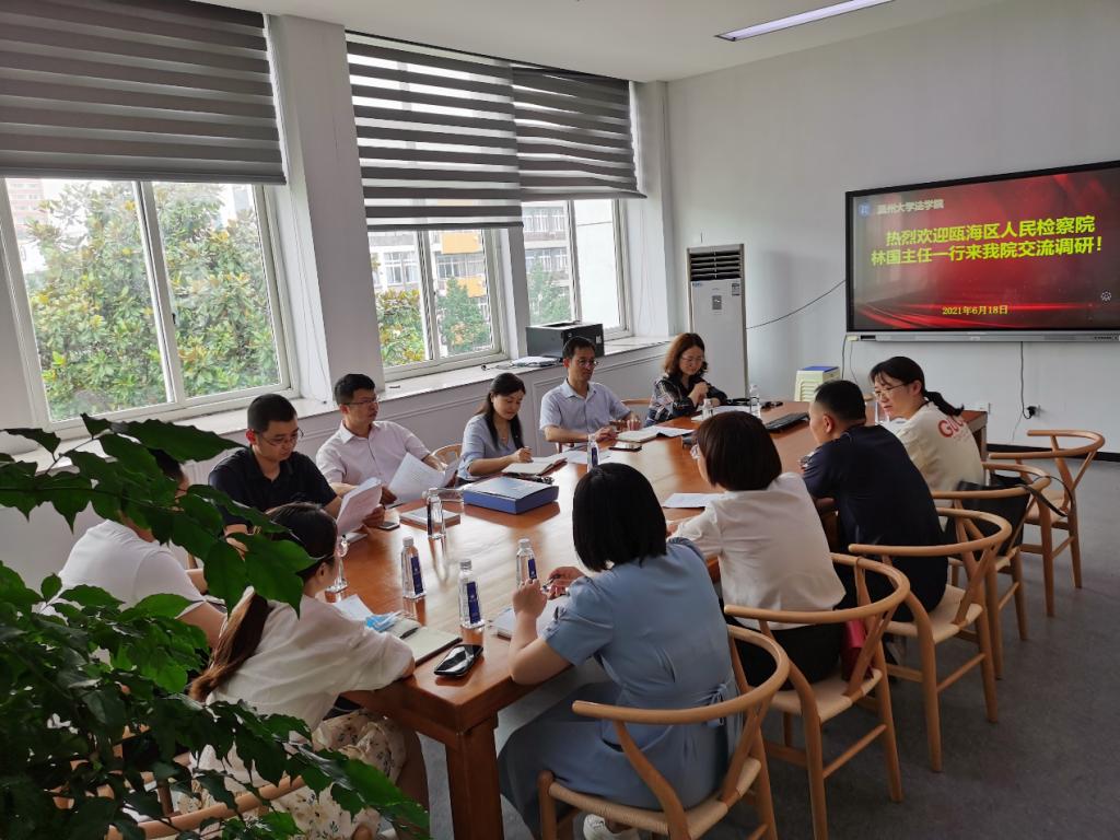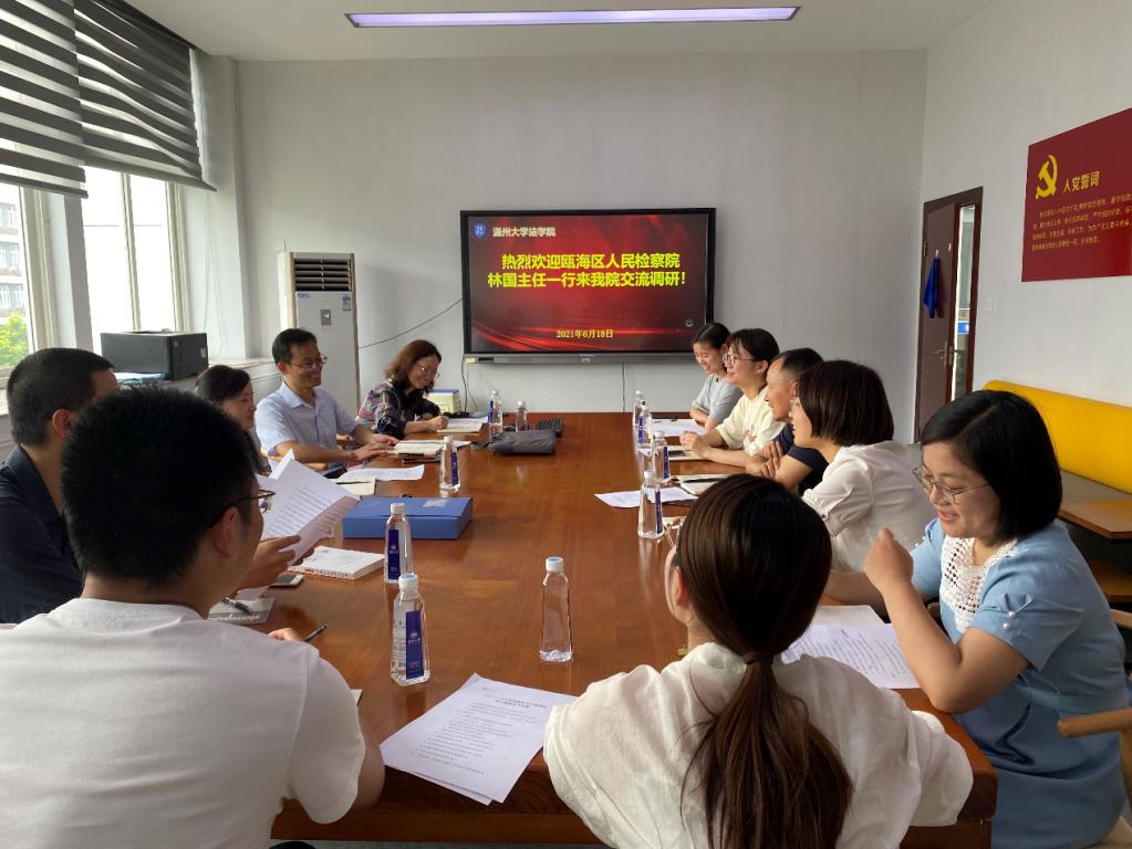 6月18日上午,瓯海区人民检察院第七检察部林国主任一行七人到麻将胡了试玩(中国)官方网站 进行考察交流,麻将胡了试玩 法律系何平副教授、谢丽珍副教授、李勇军副教授、胡剑波副教授和柯宇航博士等参加座谈。