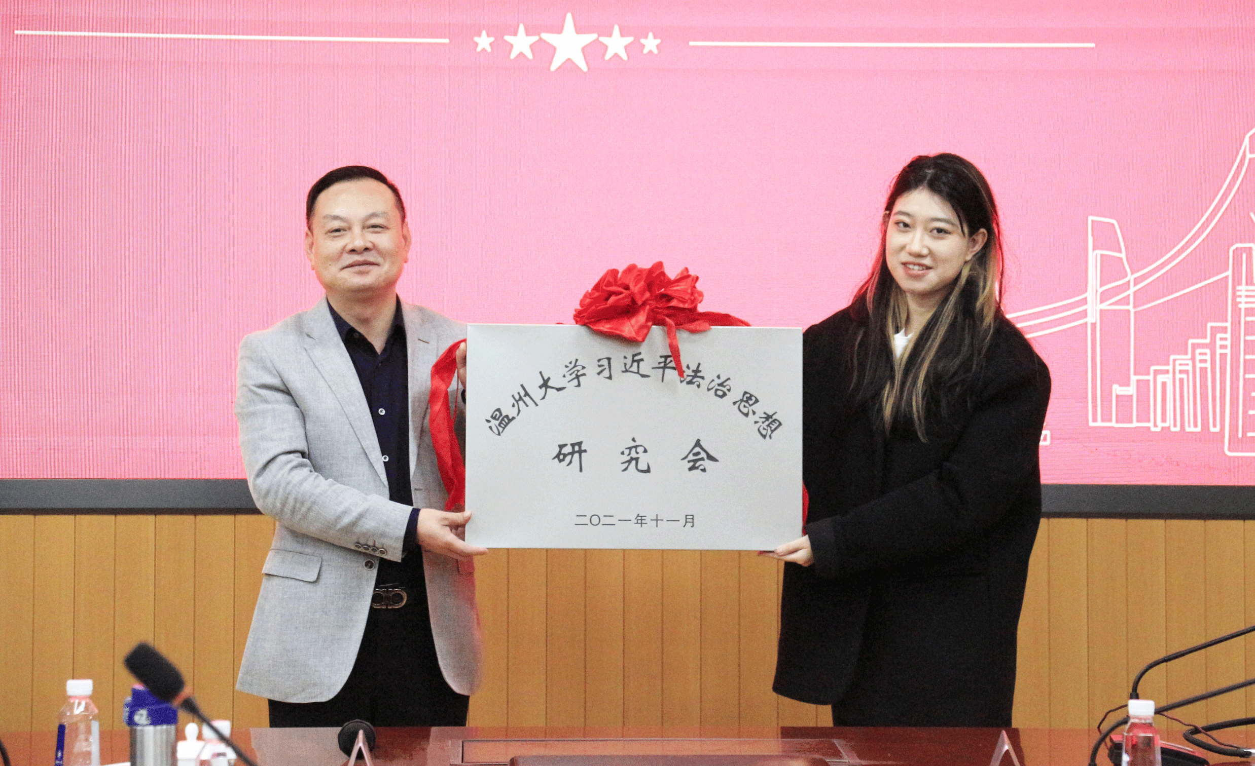 校团委副书记易招娣宣读了成立“温州大学习近平法治思想研究会”的决定,校党委委员、宣传部部长潘玉驹为该研究会授牌。