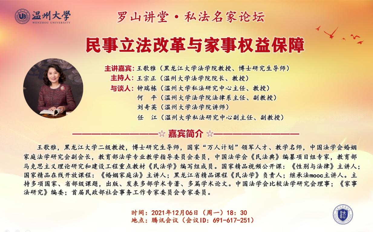 12月6日晚上六点半,黑龙江大学二级教授、博士研究生导师、国家“万人计划”领军人才、教学名师,中国法学会婚姻家庭法学研究会副会长、教育部法学专业教学指导委员会委员、中国法学会《民法典》编纂项目组专家王歌雅教授做客“罗山讲堂·私法名家论坛”,以“民事立法改革与家事权益保障”为主题,通过腾讯会议云在线的方式,为温大麻将胡了试玩 师生展开了一场精彩的学术讲座。讲座由麻将胡了试玩(中国)官方网站 院长王宗正教授主持,麻将胡了试玩(中国)官方网站 钟瑞栋教授、何平副教授、刘奇英讲师以及任江副教授与谈,任江副教授与麻将胡了试玩 21级硕士研究生集体在301会议室共同学习了讲座的内容,线上线下参与师生近200人。王歌雅教授围绕社会观念变化、民事立法改革、权益保障路径三个部分,阐述在后民法典时代,民事立法的变与不变。