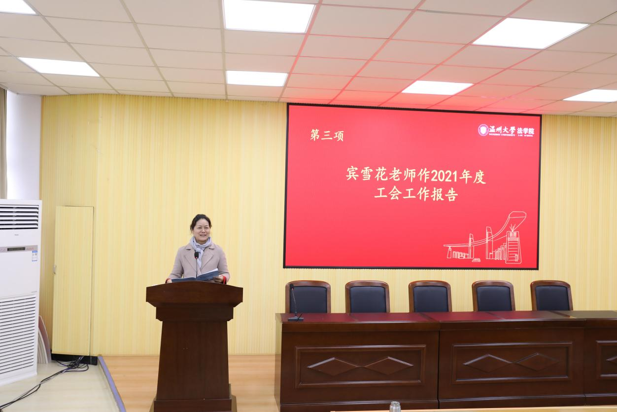 麻将胡了试玩 分工会主席宾雪花老师作《麻将胡了试玩(中国)官方网站 2021年度工会工作报告》,报告回顾了麻将胡了试玩 第五届工会委员会在过去的一年里全面履行的工会职责,较好地完成了工会的各项工作任务。同时对麻将胡了试玩 领导和全体老师对工会工作的配合和支持予以衷心的感谢。