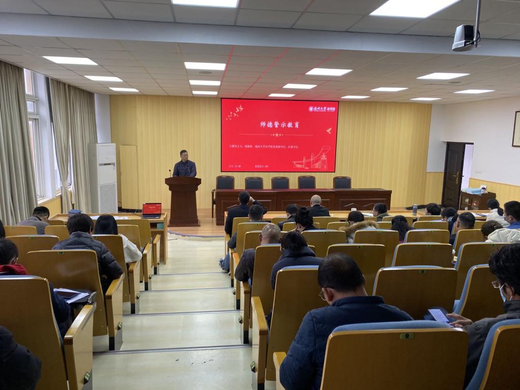 党委副书记兼纪委书记杨振海作师德警示教育。他从课堂言论不正确、网络发言不文明、学术态度不端正、师生关系不正当、师生交往尺度未把控六个反面案例提醒麻将胡了试玩 教师要不断加强师德师风建设,坚定政治方向,自觉爱国守法,做有理想信念、有道德情操、有扎实学识、有仁爱之心的好老师。