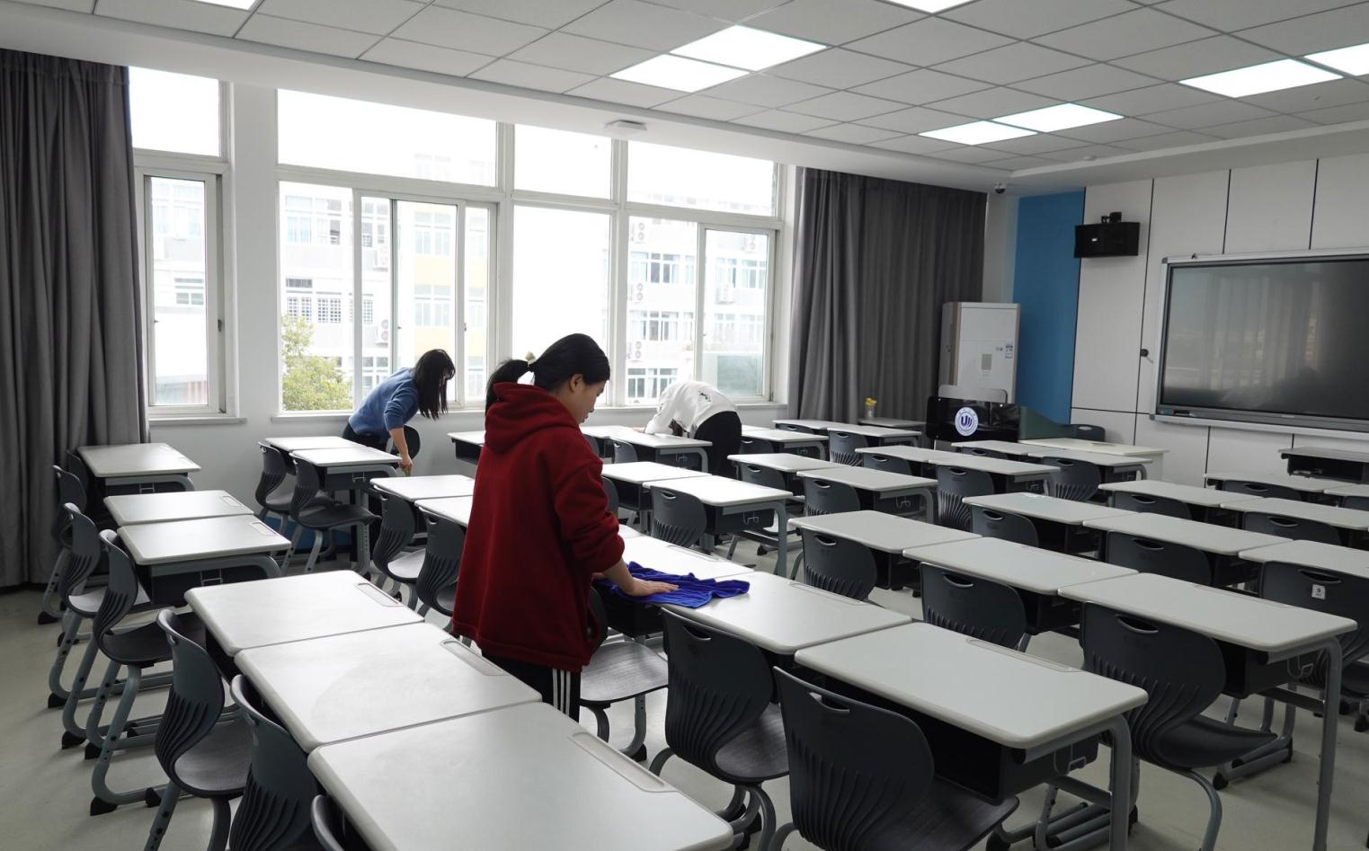 经过志愿者们的辛勤劳动,教室变得一尘不染,课桌排列整齐。大家都很期待下一次上课的时候,老师和同学们都能为此眼前一亮,以更加愉悦的心情进行教学活动。
