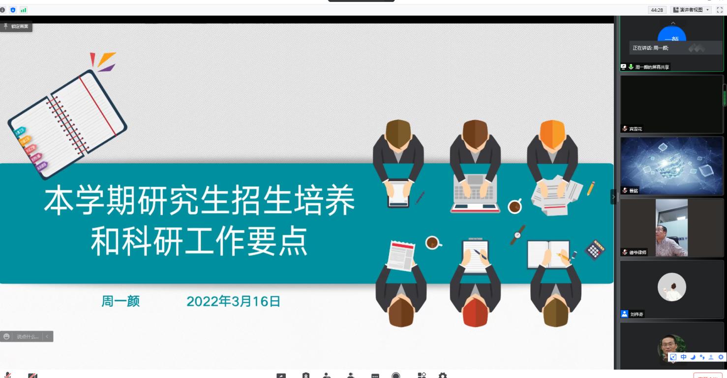 副院长周一颜作本学期研究生招生培养和科研工作要点安排。首先介绍了2022年研究生招生一志愿上线情况,其次指出研究生培养应该从导师育人、科研育人、思政育人三方面着手,加强和规范研究生全过程培养质量,最后提出实施“明确定位,大小通吃”“抢抓机遇,特色创新”“科研教研,协同育人”三大举措抓好科学研究。