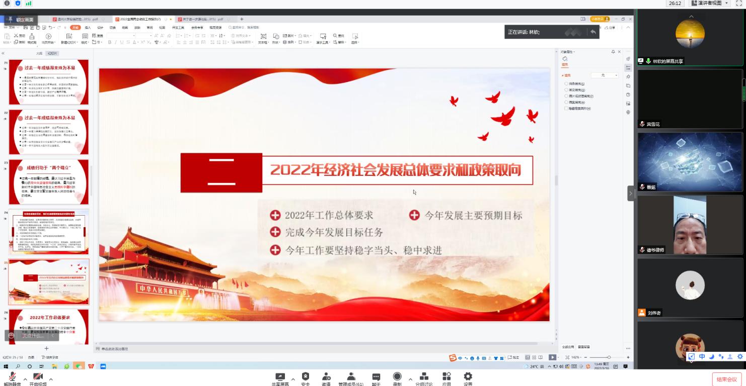 党委书记林钦带领麻将胡了试玩 全体教工学习全国两会精神。他对2021年工作回顾、2022年经济社会发展总体要求和政策取向和2022年政府工作任务进行了解读。他强调,麻将胡了试玩 全体教工要更加紧密地团结在以习近平同志为核心的党中央周围,高举中国特色社会主义伟大旗帜,要学深学透两会精神,忠诚拥护“两个确立”、坚决做到“两个维护”,贯彻落实两会精神以实际行动迎接党的二十大胜利召开。