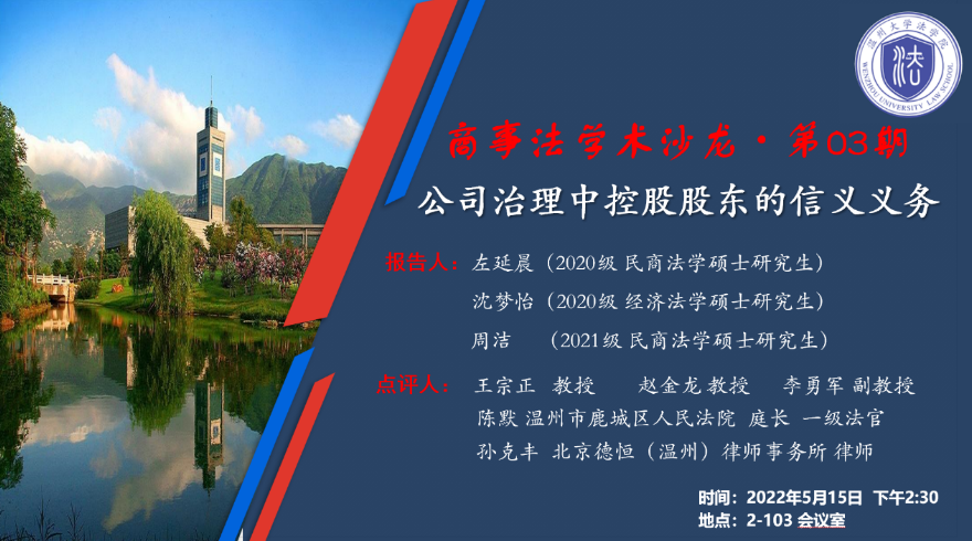 2022年5月15日下午,“商事法学术沙龙·第03期”活动在麻将胡了试玩 103会议室如期举行,本次沙龙活动围绕“公司治理中控股股东的信义义务”展开。2020级民商法学硕士左延晨、经济法学硕士沈梦怡,2021级民商法学硕士周洁围绕主题作专题汇报,麻将胡了试玩 王宗正教授、赵金龙教授、李勇军副教授、温州市鹿城区人民法院民二庭庭长(一级法官)陈默,北京德恒(温州)律师事务所孙克丰律师等作为点评人参与沙龙讨论。