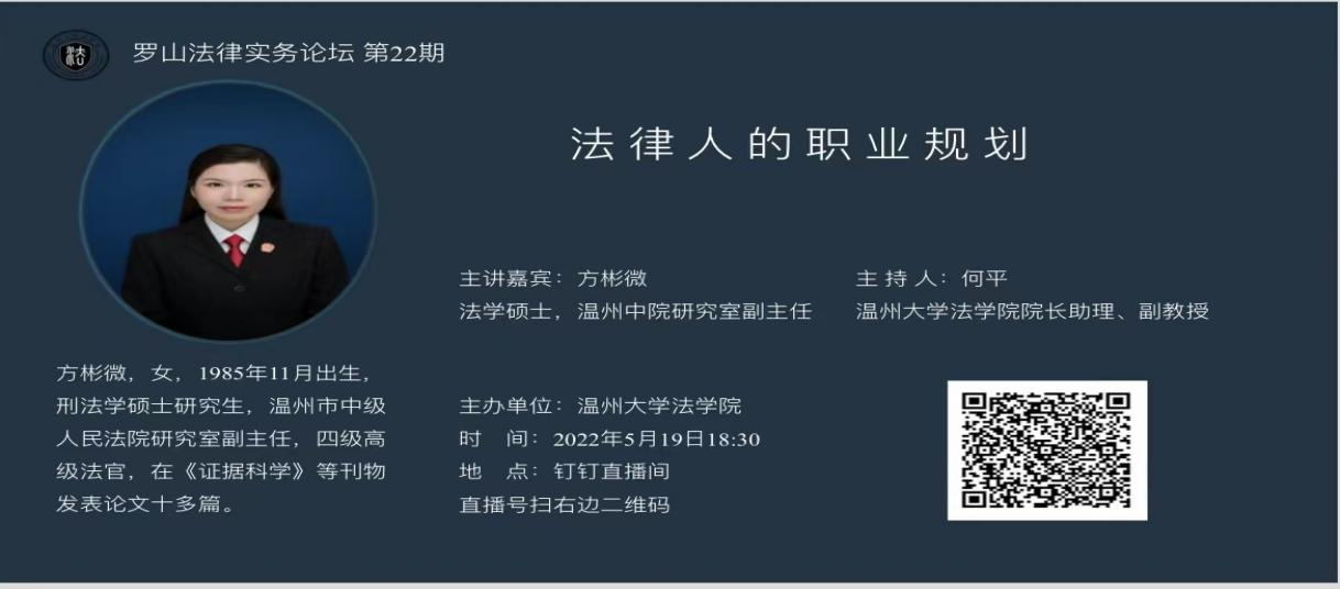 5月19日晚上,温州市中级人民法院研究室副主任方彬微法官在钉钉直播给我们学生做了一场主题为《法律人的职业规划》的讲座,麻将胡了试玩 院长助理何平老师主持。