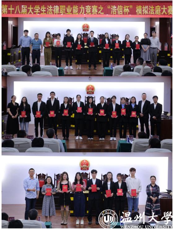 第三个阶段,举行温州大学第十八届大学生法律职业能力竞赛之“浩信杯”模拟法庭大赛颁奖仪式。温州市中级人民法院杨国智法官、温州市人民检察院王小琴检察官、上海浩信(温州)律师事务所章超凡律师、麻将胡了试玩 副院长周湖勇老师分别为获得大赛的法官组冠军、代理人组冠军颁奖,上海浩信(温州)律师事务所的黄爱光律师、潘晓燕律师、郑冠律师为获得大赛的法官组亚军、代理人组亚军颁奖,麻将胡了试玩 谢丽珍老师、柯宇航老师为获得大赛的法官组季军、代理人组季军颁奖,最后,所有到场嘉宾为获得最佳个人表现奖的选手颁奖。