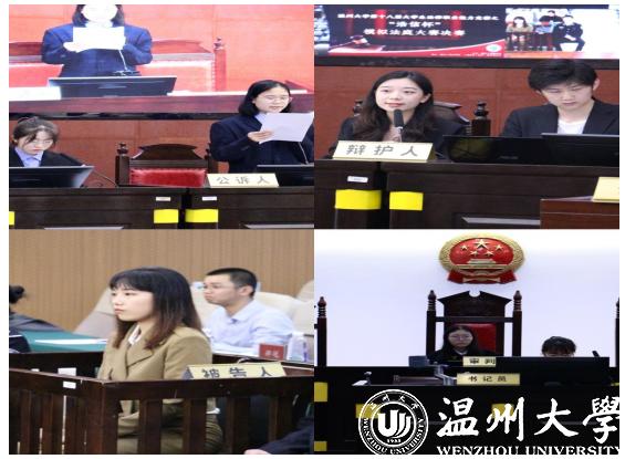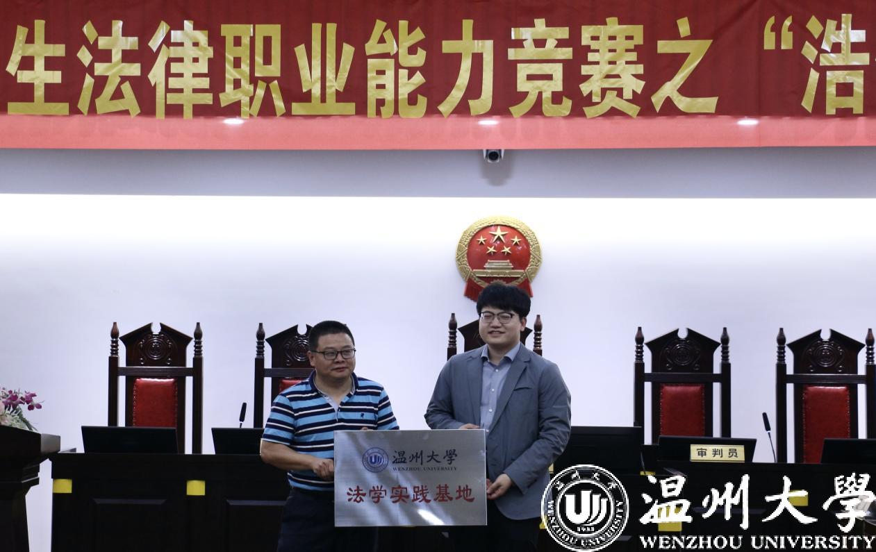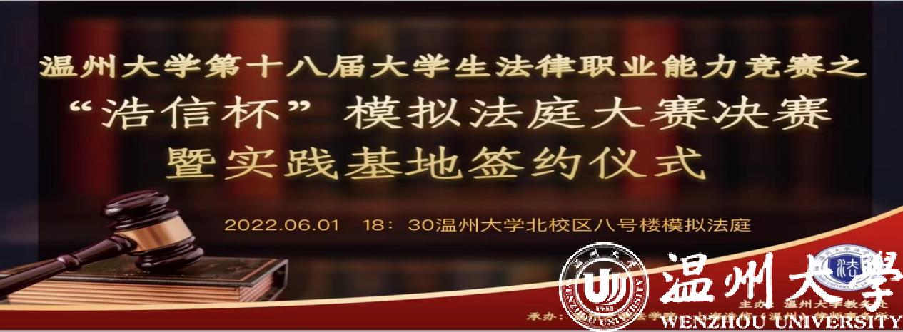 2022年6月1日晚,温州大学第十八届大学生法律职业能力竞赛之“浩信杯”模拟法庭大赛决赛暨实践基地签约仪式在麻将胡了试玩 模拟法庭举行,温州市中级人民法院刑庭庭长杨国智法官、温州市人民检察院第一检察部王小琴检察官、上海浩信(温州)律师事务所主任章超凡律师、黄爱光律师、潘晓燕律师、郑冠律师、麻将胡了试玩 副院长周湖勇老师、麻将胡了试玩 谢丽珍老师、柯宇航老师出席,麻将胡了试玩 200多名本科生、研究生参加。
