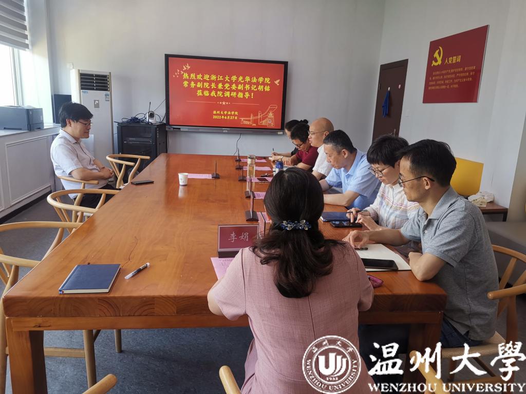 6月27日上午,浙江大学光华麻将胡了试玩 常务副院长兼党委副书记胡铭莅临麻将胡了试玩(中国)官方网站 调研指导,麻将胡了试玩 院长王宗正等领导和法学相关系主任出席座谈会。