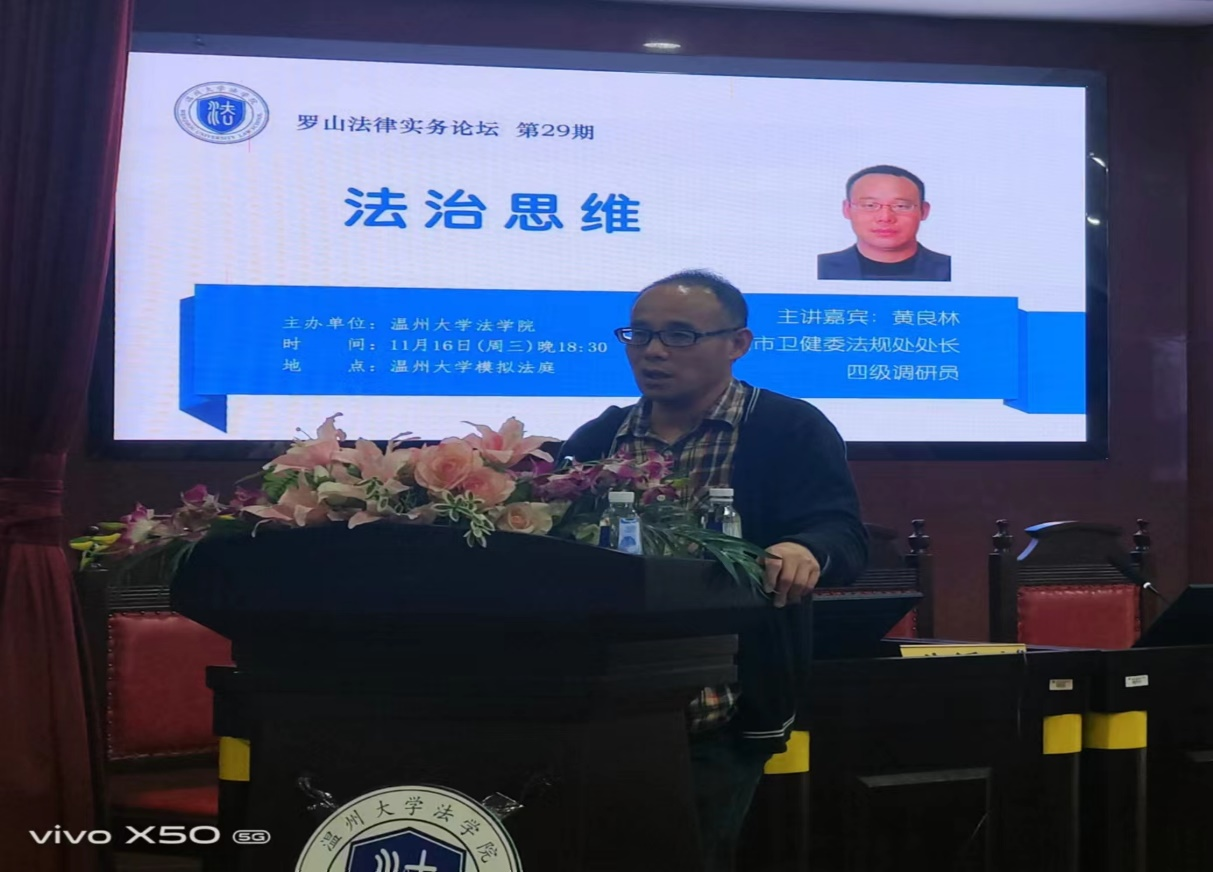 11月16日晚,温州市卫健委法规处处长黄良林应邀作客“罗山法律实务论坛”,为麻将胡了试玩 师生带来题为《法治思维》的讲座。讲座由麻将胡了试玩(中国)官方网站 法学专业业负责人、民商经济法系主任李勇军副教授主持,在麻将胡了试玩(中国)官方网站 模拟法庭举行。