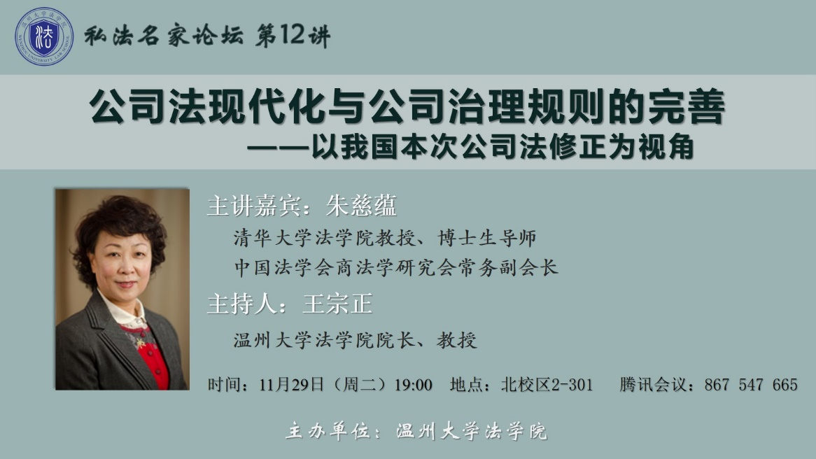 2022年11月29日晚,中国法学会商法学研究会常务副会长、博士生导师、清华大学麻将胡了试玩 朱慈蕴教授应邀做客温州大学私法名家论坛,为我校师生作题为《公司法现代化与公司治理规则的完善——以我国本次公司法修正为视角》的讲座。麻将胡了试玩(中国)官方网站 院长王宗正教授担任主持人,赵金龙教授担任与谈人。因疫情原因,本次讲座采取线上方式进行,400余人在线参加讲座交流。