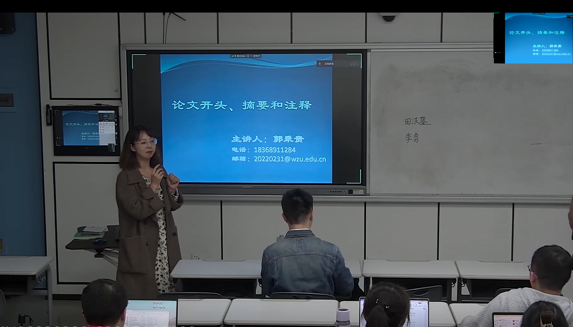 课程伊始,郭秉贵老师结合《温州大学研究生学位论文格式规定》,就学位论文写作要点和注意事项一一进行讲解,通过对照分析多份优秀硕士学位论文样本,与同学们一起探讨如何规范书写学位论文,有效规避论文写作过程中容易出现的低级错误。