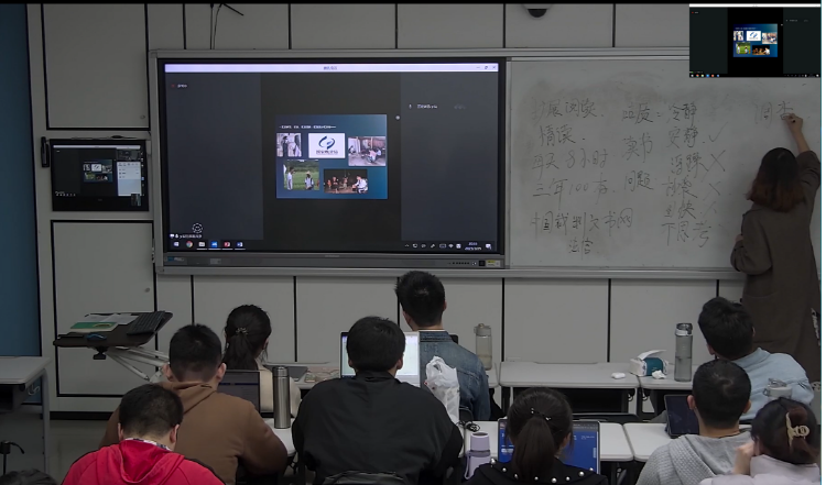 最后,双师同堂写作课程在师生互动中拉下了帷幕。郭秉贵老师不时在教室走动,与同学们就论文写作、投稿中遇到的难题进行交流,遇到提问的同学,上前做耐心细致解答。同学们纷纷表示,双师同堂教学形式新颖,“一次课程,两种风格,多重收获”,希望能有机会再次体验这样的教学模式。