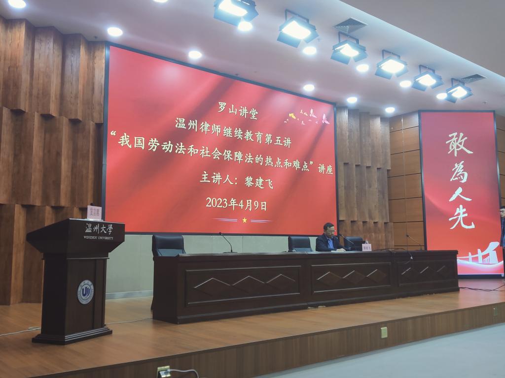 2023年4月9日下午,中国人民大学麻将胡了试玩 教授、博导黎建飞老师受邀作客温州大学罗山讲堂,在南校区岩松堂雁山厅做题为《我国劳动法和社会保障法的热点和难点》的讲座。参加此次讲座的人员除了我校师生外,还有来自温州市中级人民法院、温州市人社局、鹿城区人社局、温州市律师协会以及多家律师事务所的优秀法律工作者。