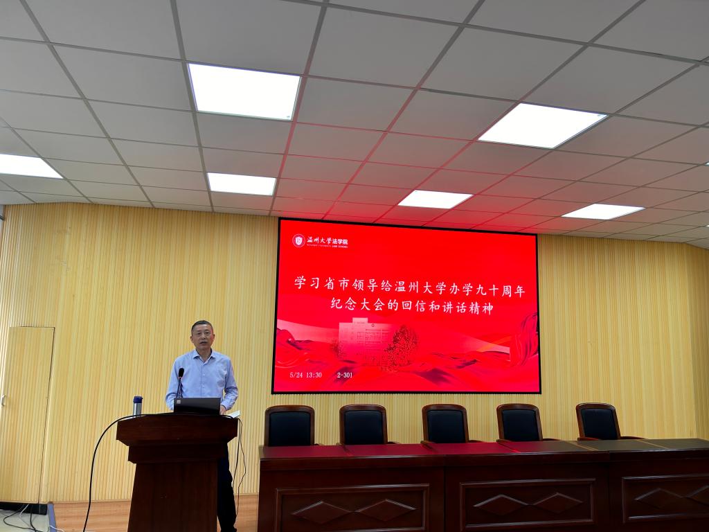 林钦书记传达了省市领导给温州大学办学九十周年纪念大会的回信和讲话精神。在温州大学庆祝办学90周年之际,浙江省委书记易炼红给温州大学回信祝贺勉励,温州市委书记刘小涛出席温州大学办学90周年纪念大会并致辞讲话,充分肯定了学习90周年办学成就,对学校发展寄予殷切希望。张健书记强调,要进一步提高政治站位,深刻领悟回信和讲话精神重要意义,锚定目标定位,抢抓机遇促进学校能级跃升,增强使命感,加快推进学校内涵式高质量发展。赵敏校长强调,要拼搏争先、砥砺奋进,切实把回信精神和讲话精神转化为谋划工作的思路、推进工作的举措,奋力推动学校加快实现高质量内涵式发展,在浙江忠实践行“八八战略”、奋力推进“两个先行”和温州“续写创新史、走好共富路”的伟大实践中展现新的更大作为。