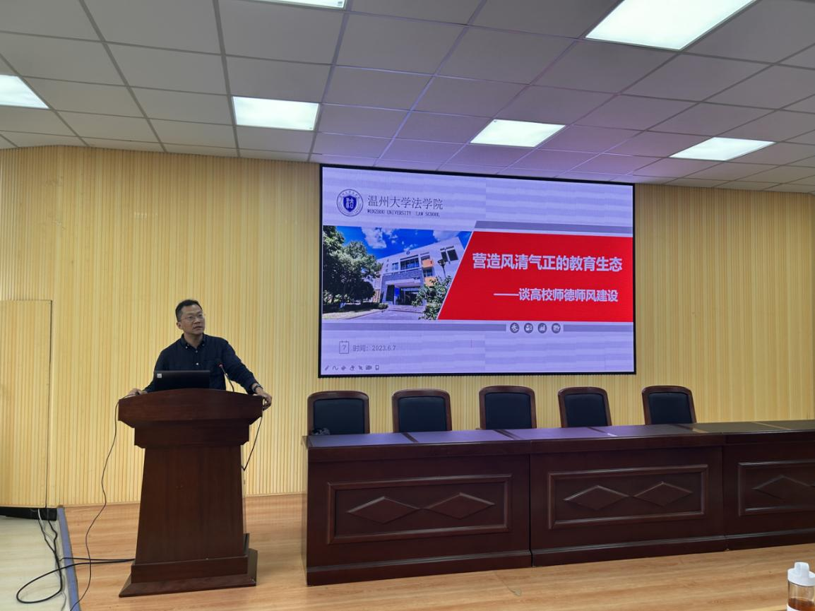 党委副书记杨振海以《营造风清气正的教育生态——谈高校师德师风建设》为题作师德师风廉政教育宣讲。他从习近平总书记考察中国人民大学时的讲话精神、从党和国家重视新时代教师队伍建设看师德师风、从全面从严治党和清廉学校建设看师德师风、从高校师德失范案例中汲取经验与教训四个方面进行宣讲。他重点强调了高校教师7条红线和《关于加强新时代高校教师队伍建设改革的指导意见》在教师队伍建设上的主要体现,并对今年初中共中央办公厅印发的《关于加强新时代廉洁文化建设的意见》做了解读,通过高校师德失范典型案例进行警示,提醒教师在教学、科研、经费管理与使用、师生关系、违法行为等方面保持清醒头脑,杜绝师德违法违规行为。