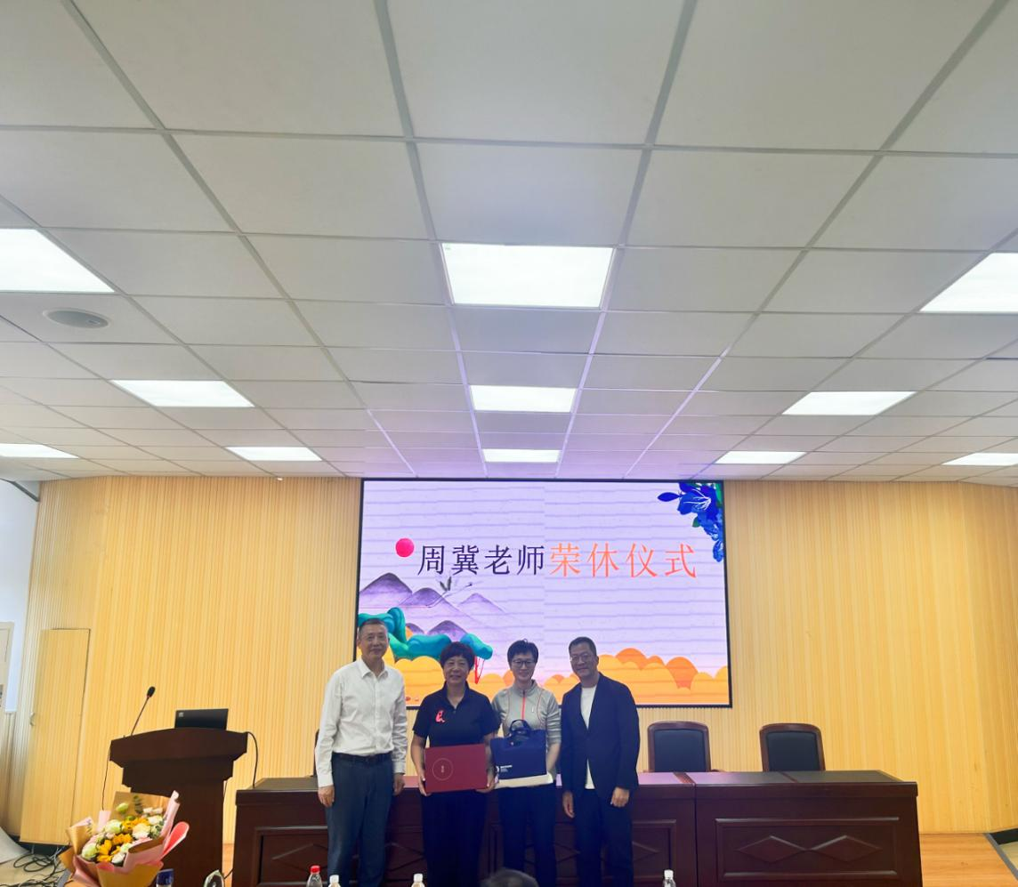 最后,全体教师为周冀老师举办了荣休仪式。周冀老师1986年分配到温州大学工作至今,任过老师,后因工作需要从事行政管理工作。曾在学生处、就业处、体育麻将胡了试玩 任领导职务,于2019任麻将胡了试玩 组织员,今年十月份光荣退休。三十余年来,周老师兢兢业业,认真负责,为学校和麻将胡了试玩 发展无私奉献。欢送仪式简朴祥和而又庄重热烈,进一步激发了全体教职工爱校如家的热情。