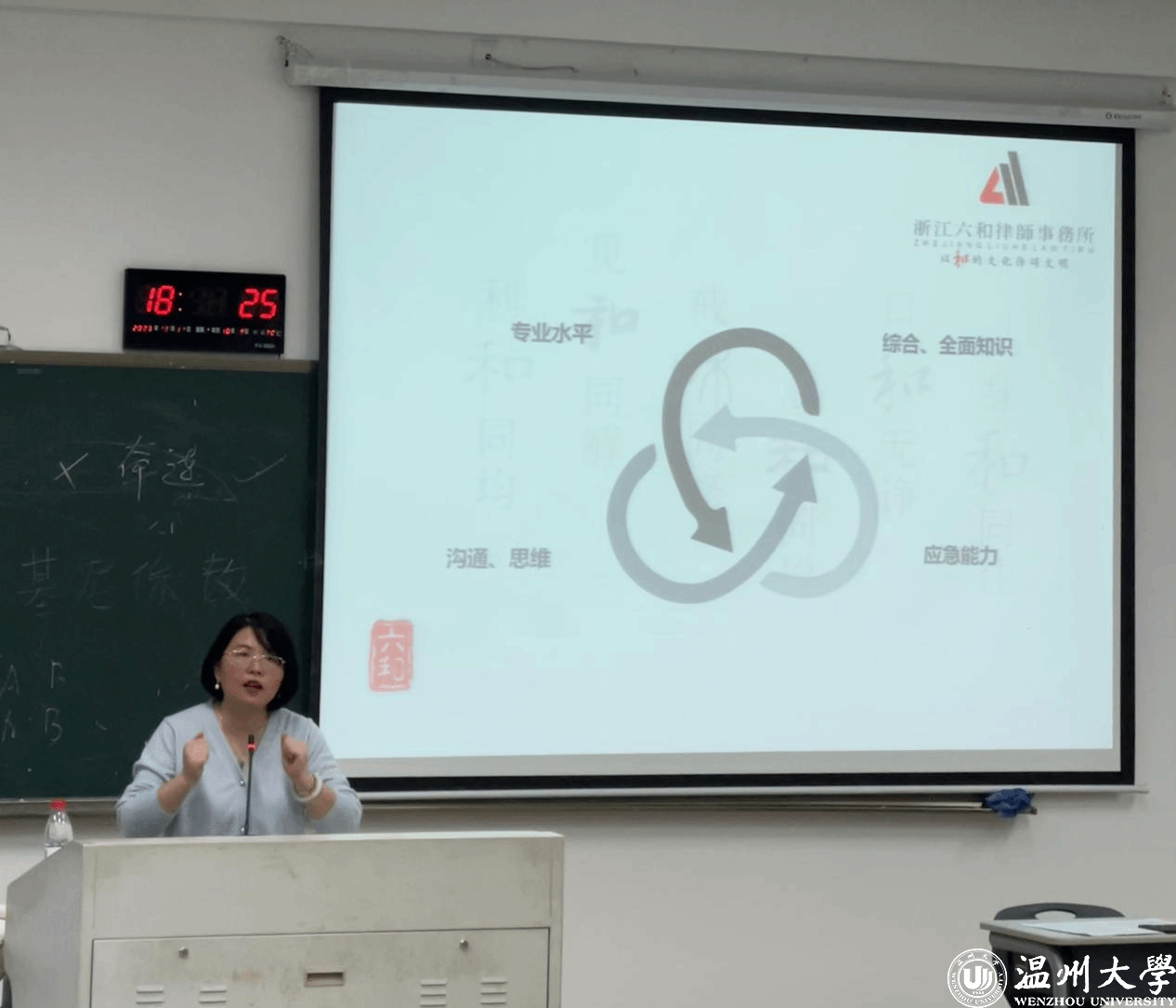 2023年12月11日,鹿城区政协委员、浙江六合(温州)律师事务所林晓露律师应邀为麻将胡了试玩 企业法务理论课和企业法务综合实践课的同学讲授法律实务,讲座主题“法律顾问服务”。讲座开始前,周湖勇教授强调企业法务课程对法学生的重要性及麻将胡了试玩(中国)官方网站 已经系统开展该项课程十余年,课程设置已较为全面完善,走在前列。