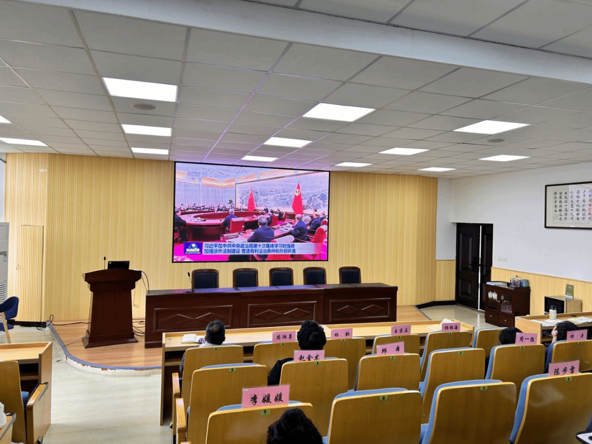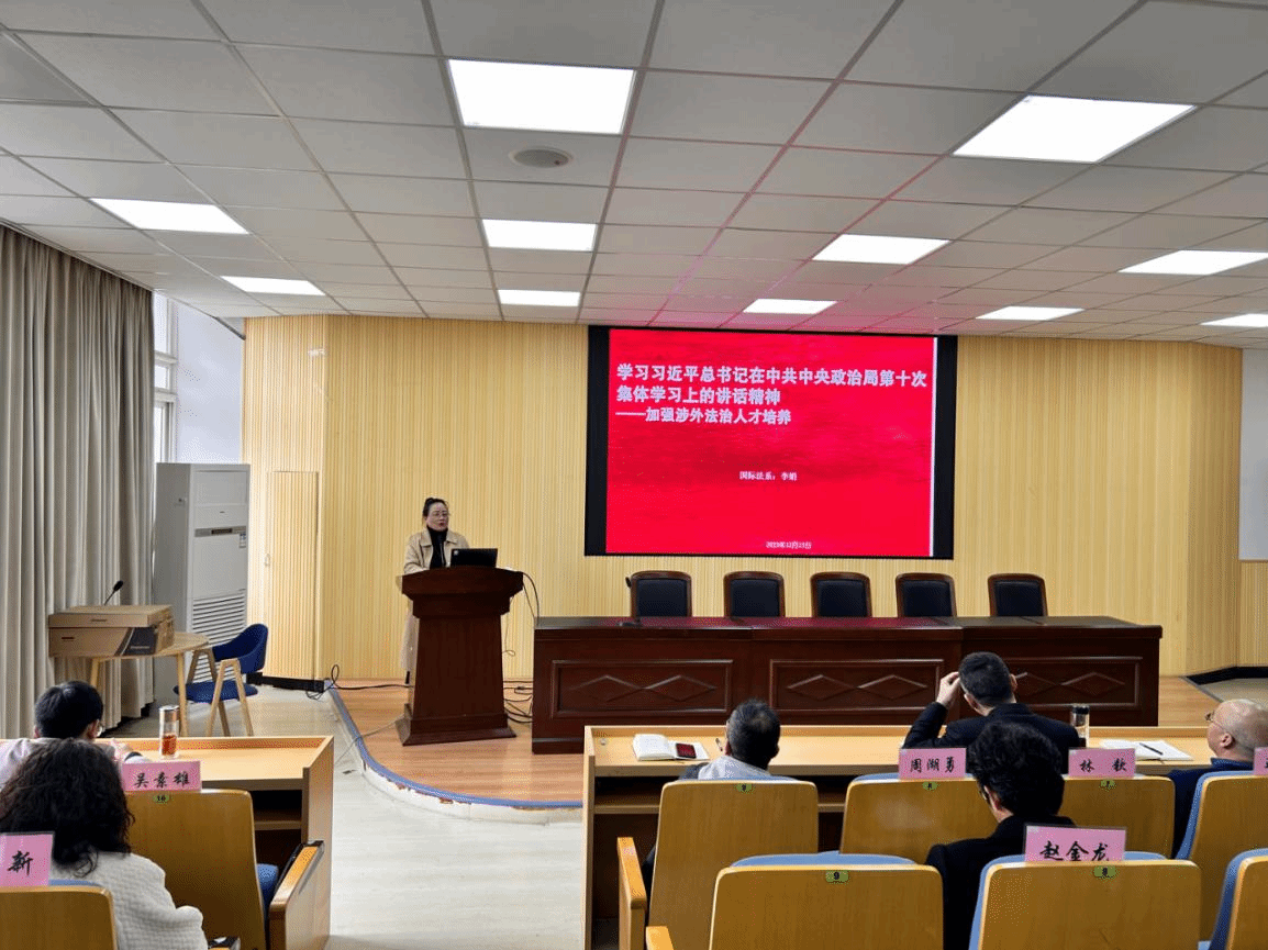 全体教师共同学习习近平总书记在二十届中共中央政治局第十次集体学习上的重要讲话精神。习近平总书记强调,加强涉外法治建设既是以中国式现代化全面推进强国建设、民族复兴伟业的长远所需,也是推进高水平对外开放、应对外部风险挑战的当务之急。要从更好统筹国内国际两个大局、更好统筹发展和安全的高度,深刻认识做好涉外法治工作的重要性和紧迫性,建设同高质量发展、高水平开放要求相适应的涉外法治体系和能力,为中国式现代化行稳致远营造有利法治条件和外部环境。要坚定法治自信,积极阐释中国特色涉外法治理念、主张和成功实践,讲好新时代中国法治故事。