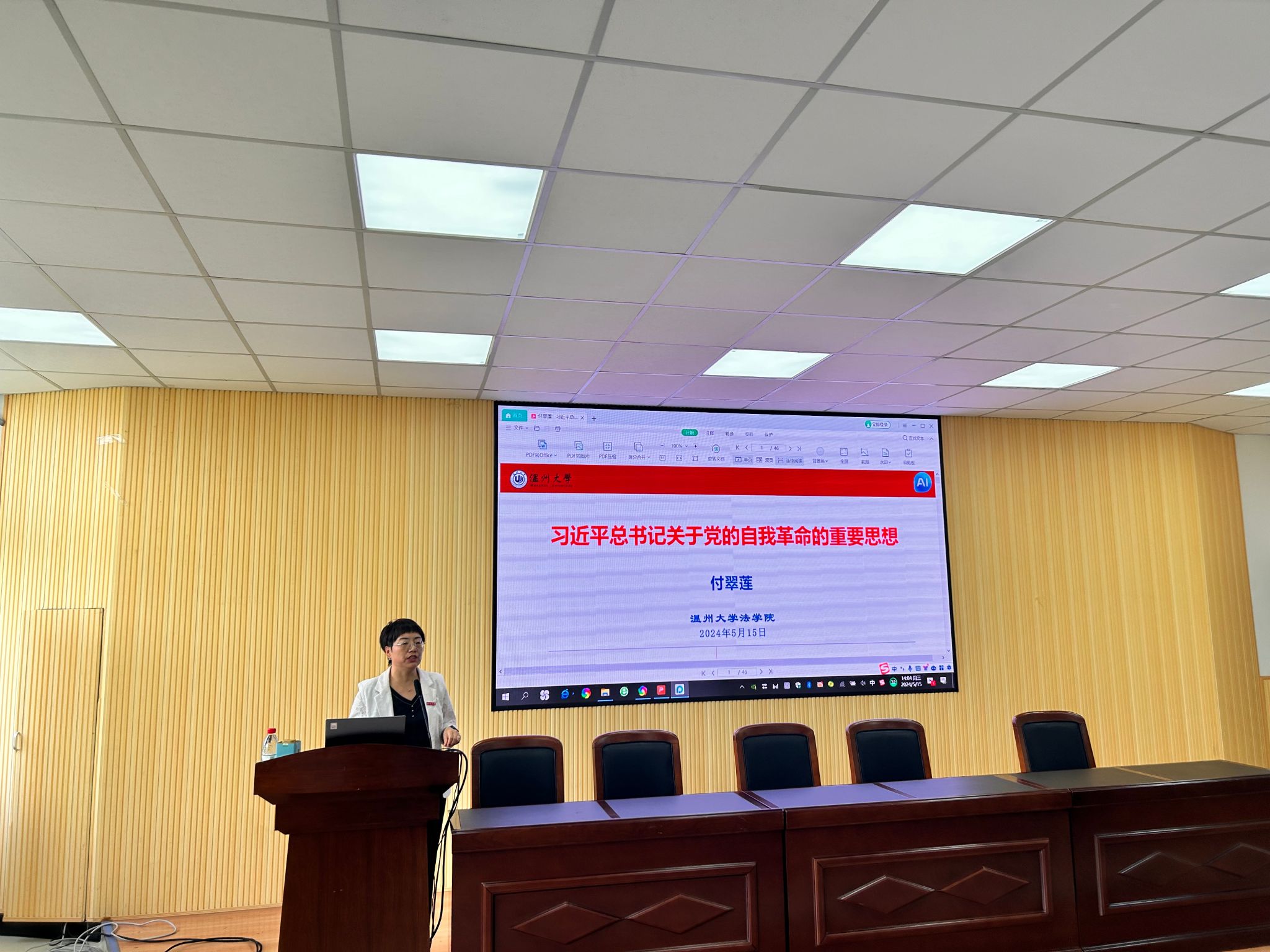 付翠莲老师以《习近平总书记关于党的自我革命的重要思想》为主题,从我们党为什么要自我革命、我们党为什么能自我革命、我们党如何推进自我革命三个方面作分享。她指出,自我革命永远在路上,反腐没有休止符。新时代坚持和加强党的领导,必须持之以恒抓党风廉政建设。新征程上,我们要深刻领会习近平总书记关于党的自我革命的重要思想的精髓要义、实践要求,纵深推进全面从严治党,中国共产党必将在新的赶考之路上向历史和人民交出新的优异答卷。