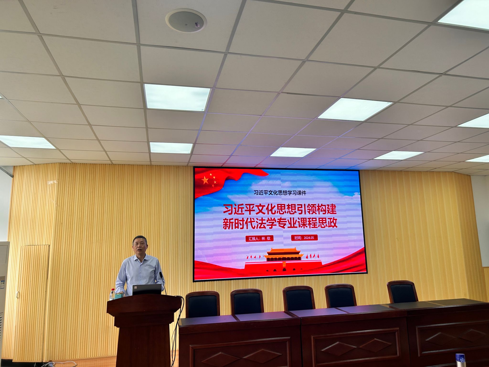 林钦书记以《习近平文化思想引领构建新时代法学专业课程思政》为题作习近平文化思想学习分享。他指出,习近平文化思想为大学课程思政提供方向指引,推动大学教学的内涵深化,推动新时代课程思政的高质量发展。在思政教育理论和实践方法的引导下,课程思政体系的完善强化了法学专业教学目标和专业育人导向,不断推动法学专业学生的综合专业能力稳步提升。