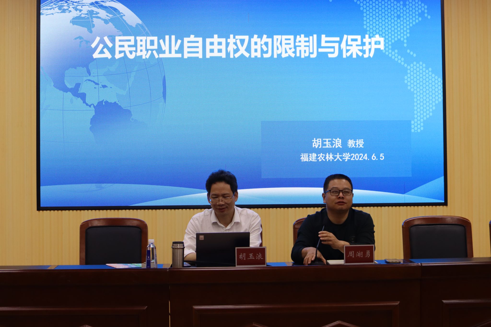 2024年6月5日晚,福建农林大学教授胡玉浪应邀做客麻将胡了试玩(中国)官方网站 社会法学术沙龙第8期,为麻将胡了试玩(中国)官方网站 师生讲授《公民职业自由权的限制与保护》主题讲座。本次沙龙在麻将胡了试玩 301会议室举行,由麻将胡了试玩(中国)官方网站 副院长周湖勇教授主持,麻将胡了试玩(中国)官方网站 柯宇航老师、汪银涛老师及麻将胡了试玩 部分本科生、研究生参加了此次沙龙。