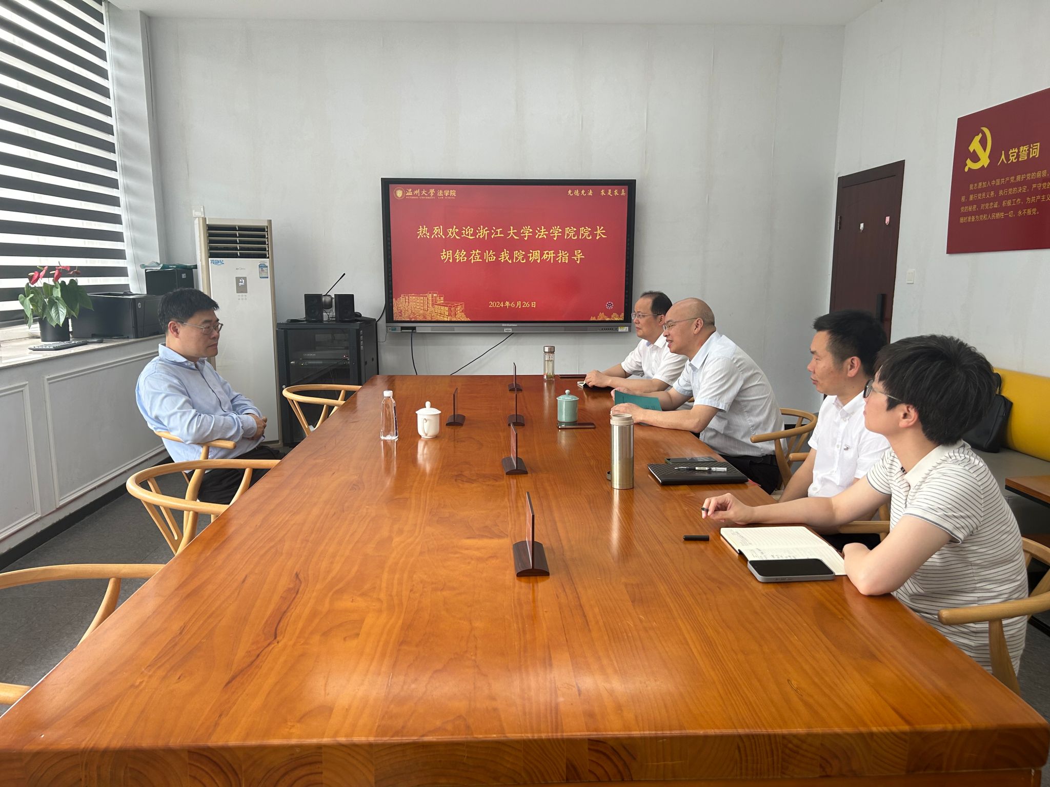 6月26日上午,浙江大学光华麻将胡了试玩 院长兼党委副书记胡铭教授莅临麻将胡了试玩(中国)官方网站 调研指导,院长王宗正、党委书记周敬业、副院长叶肖华和副院长周一颜出席座谈会。
