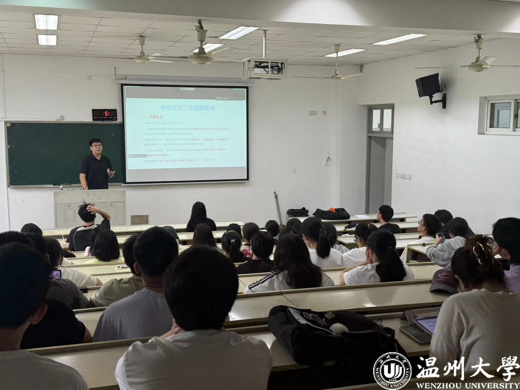 周一颜副院长结合教育部、浙江省和学校的相关规定,向与会同学说明了本科毕业论文的重要性,强调各位同学要全身心投入毕业论文的撰写工作,切实提升毕业论文的质量,为自己的本科生涯画上圆满的句号。在此过程中,周一颜副院长就2025届本科毕业论文工作安排中新增的环节向与会同学进行了介绍,重点对选题论证、中期检查和交叉评阅三个环节增设必要、具体流程和基本要求进行了说明。除此之外,周一颜副院长还强调了毕业实习工作的基本要求,尤其是实习纪律问题。