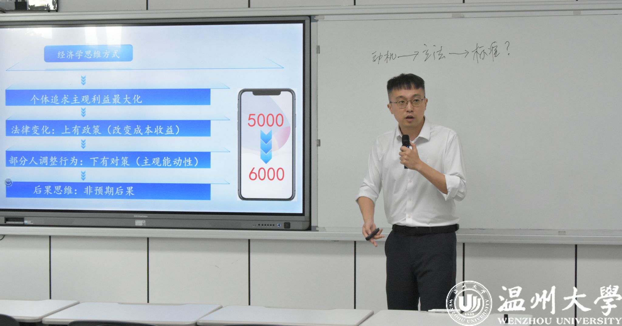 陈以拓老师以“子贡赎人”的典故巧妙导入了本次授课主题,并在法律层面上深刻剖析最低工资法与房屋管制法背后的多元后果,强调了真实世界的复杂性和后果思维的重要性,最后联系共同富裕这一现实问题,鼓励学生站在法律人视角去审视其法律后果,教学内容融深度与思辨于一体。