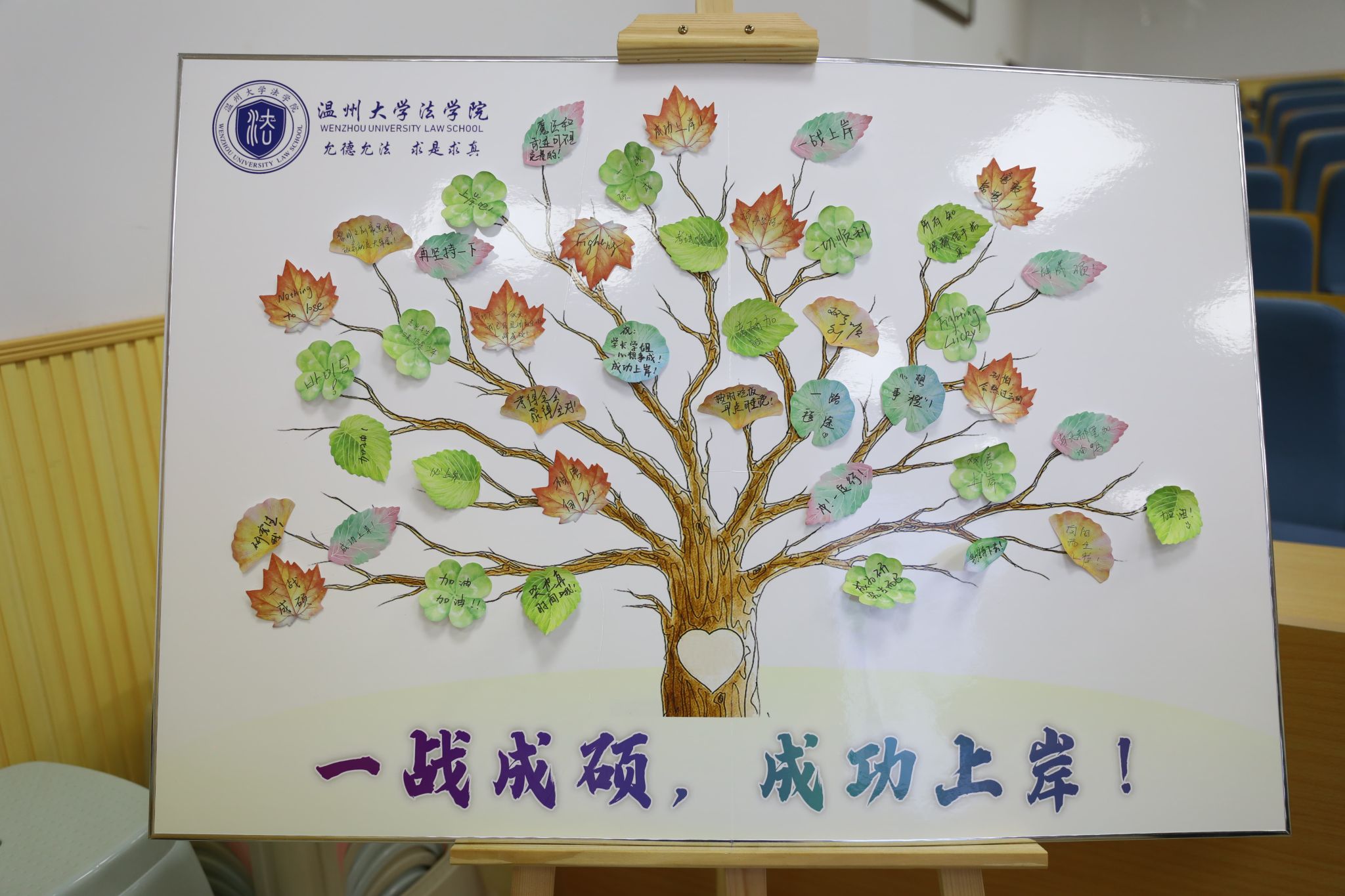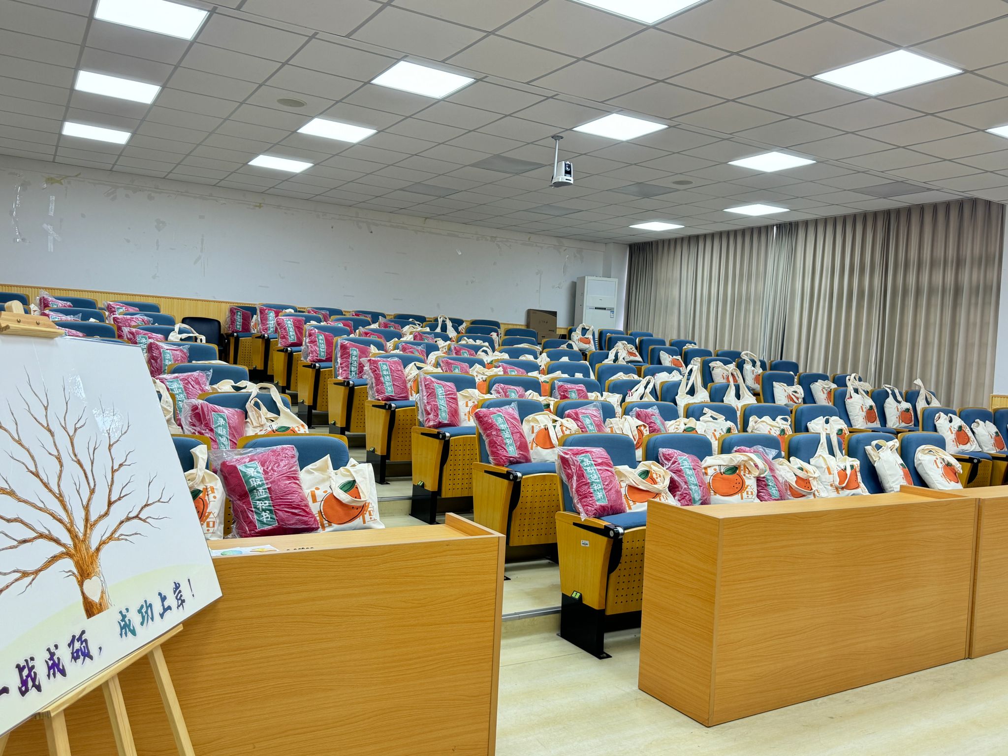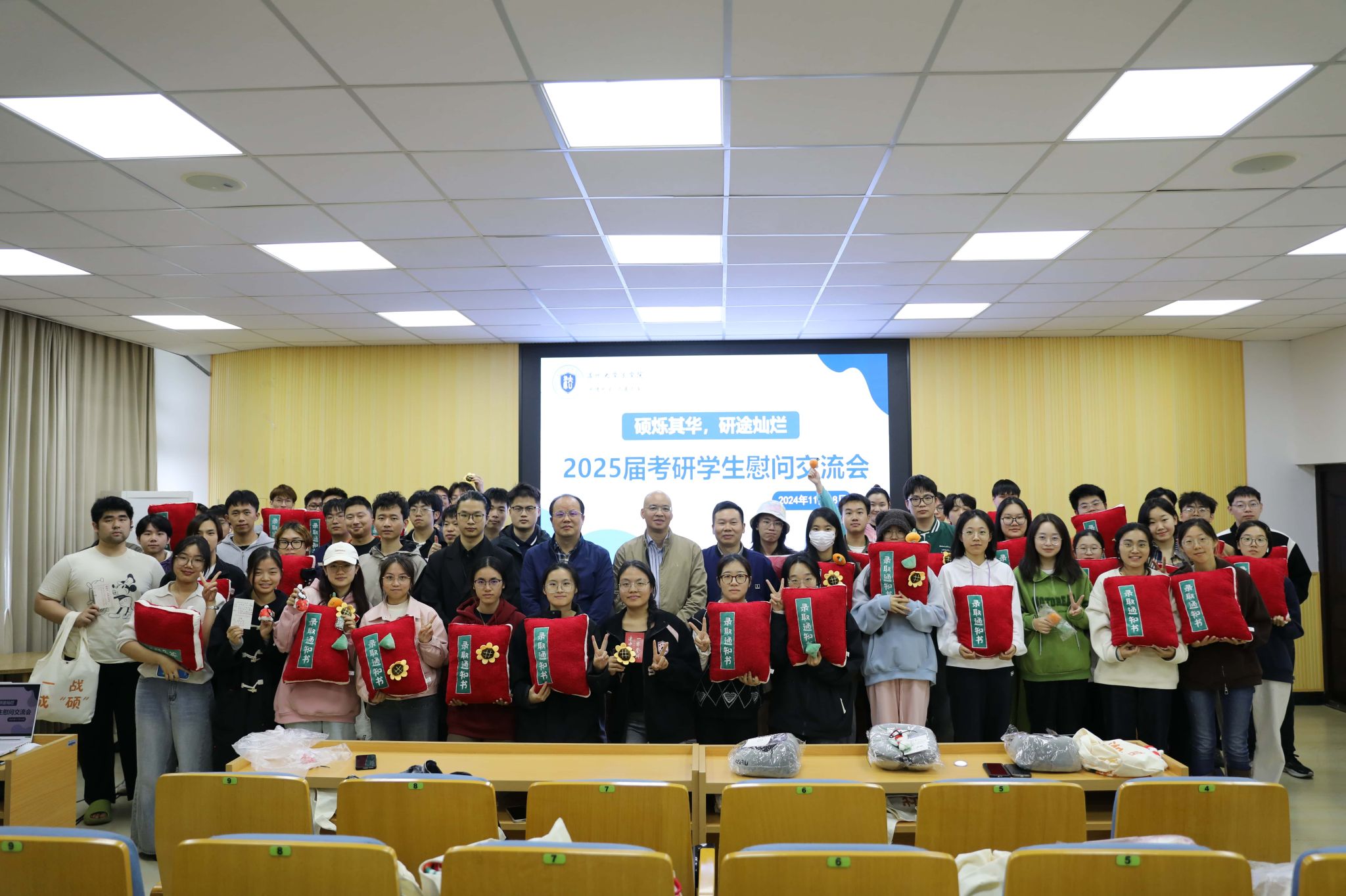本次交流会还精心准备了送祝福环节,同学们将目标和祝福写在了“希望树”上,院领导们也为考研学子送上了寓意满满的慰问礼品,包括“橙子”帆布包、U型枕、明信片、毛毯和抱枕。希望同学们心想事“橙”,一战成“硕”,在接下来的日子里能够一路“毯”途,“枕”着书海而眠,梦醒便是硕果累累。请相信吧,在日复一日的努力中,成功“上岸”定会“信”手拈来!