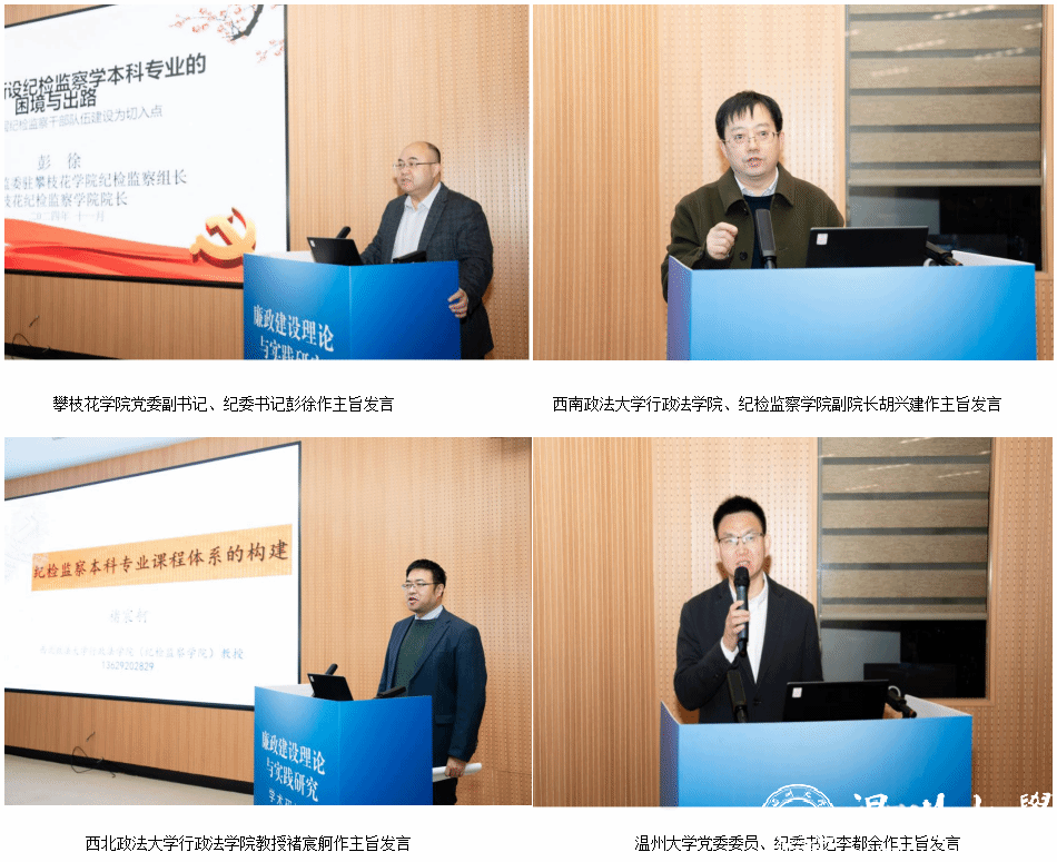 麻将胡了试玩(中国)官方网站 副院长、教授叶肖华主持主旨报告。四川省纪委监委派驻攀枝花麻将胡了试玩 纪检组长、攀枝花麻将胡了试玩 党委副书记、纪委书记、攀枝花纪检监察麻将胡了试玩 院长彭徐作《地方高校新设纪检监察学专业的困境与出路——以基层纪检监察干部队伍建设为切入点》主旨发言,西南政法大学行政麻将胡了试玩 、纪检监察麻将胡了试玩 副院长、教授胡兴建作《正确处理政治与法治的关系,推进纪检监察学学科建设》主旨发言。西北政法大学行政麻将胡了试玩 、纪检监察麻将胡了试玩 教授、监察法学学科带头人褚宸舸作《纪检监察本科专业课程体系的建构》主旨发言。温州大学党委委员、纪委书记、省监委驻温大监察专员李都金作《习近平法治思想与纪检监察工作“三个效果”有机统一研究》主旨发言。