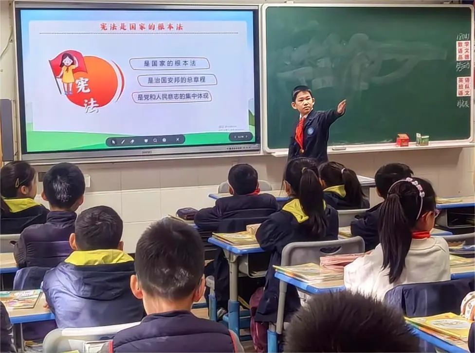 在杭州市西兴实验小学的班队课上,“宪法小卫士”以生动有趣的形式,向队员们普及宪法知识,让大家深知宪法是国家的根本法,是一切行为的准则。