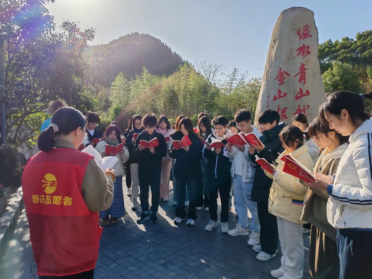 国家宪法日前夕,浙江科技大学安吉校区党总支联合安吉县社会治理中心、县司法局孝源司法所、天荒坪司法所等单位开展“沿着总书记的足迹 学习习近平法治思想”法治教育实践活动。在安吉余村,同学们一起学习重温宪法,还详细了解了余村的基层法治建设情况,以及村规民约制定、法治文化普及、民主法治实践等方面的创新举措和显著成效。