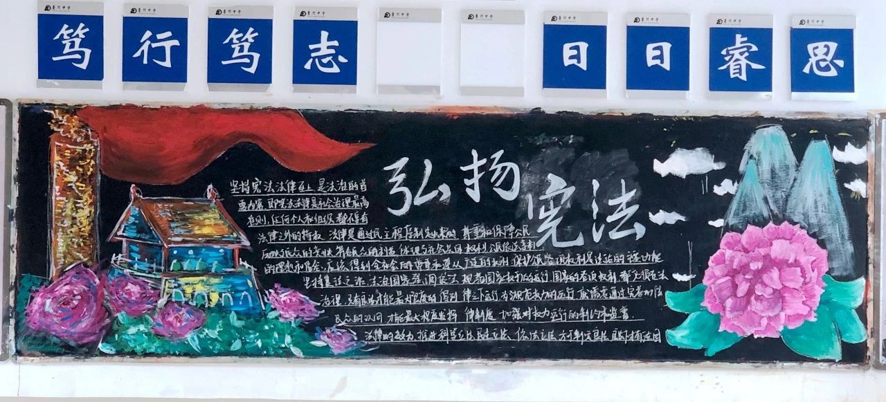 浙江省普陀中学各班举办了以“学宪法、讲宪法”为主题的班级板报评比活动,同学们通过精美的绘画和详实的文字说明,将对宪法知识的深切理解绘制在黑板报上。