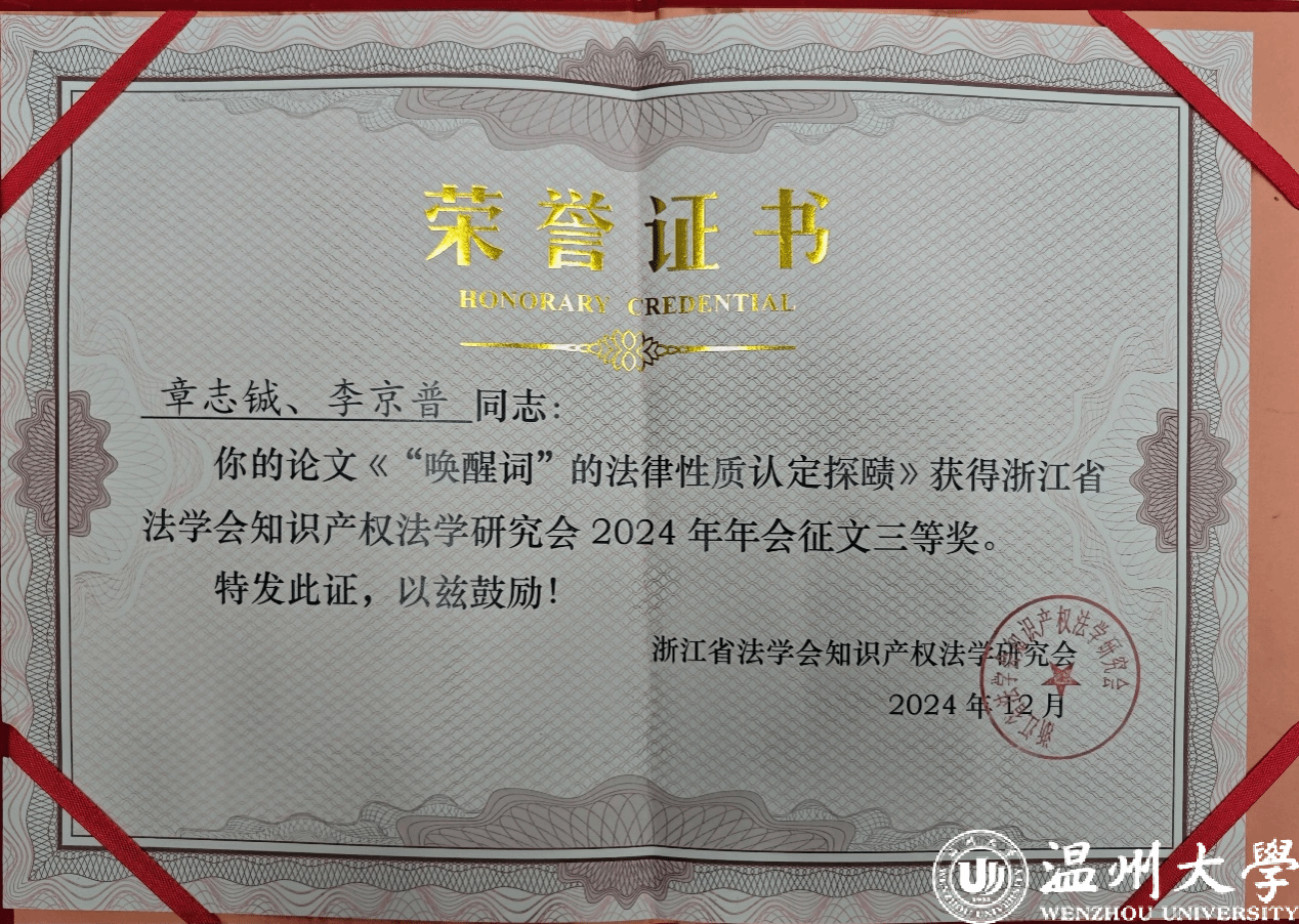 2024年12月7日,浙江省法学会知识产权法学研究会2024年年会暨“知识产权赋能新质生产力发展”学术研讨会在宁波隆重召开。麻将胡了试玩 李京普老师与温州大学知识产权培训基地学生服务团队一行参加了本次会议。