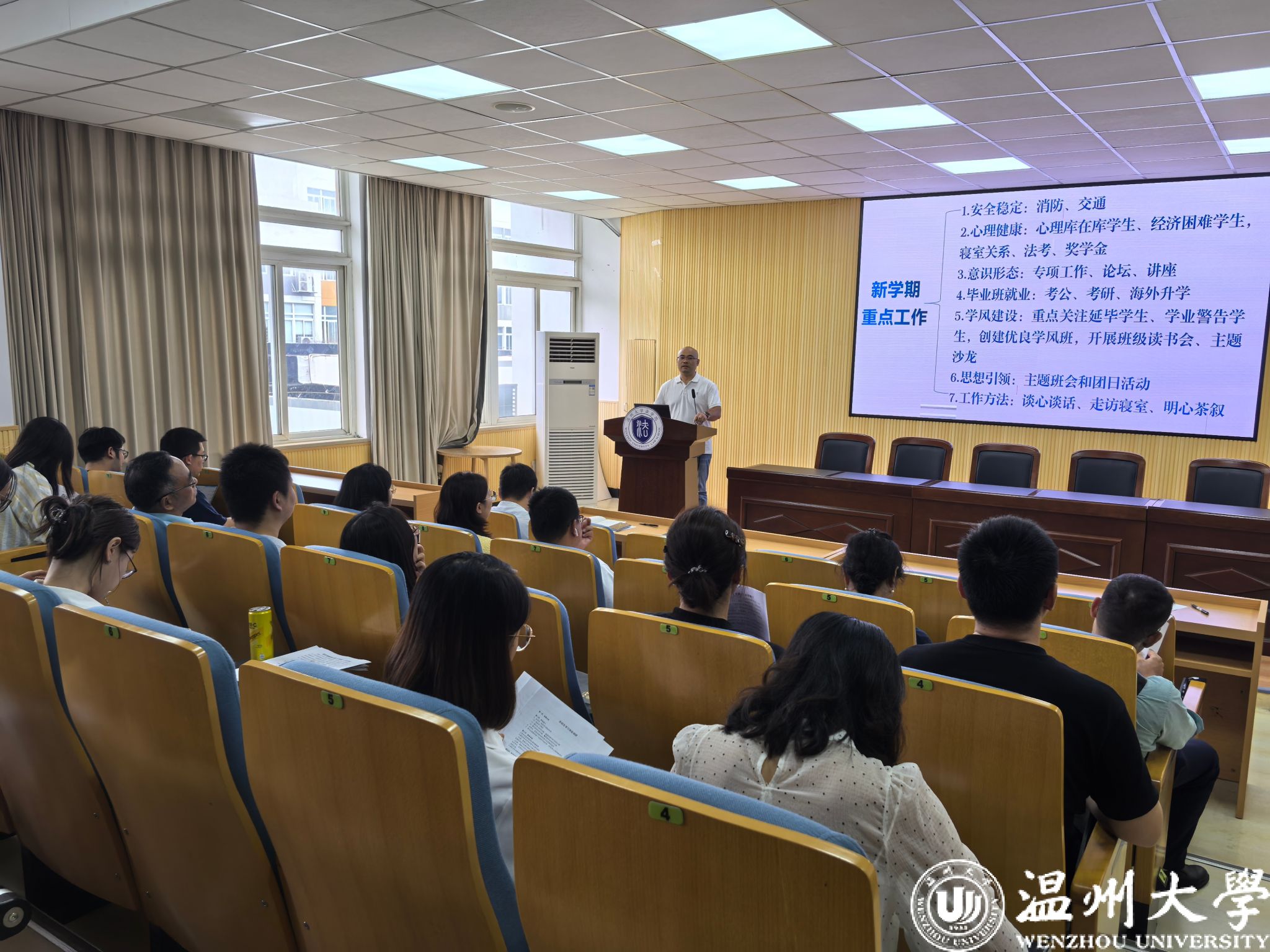 会上,郑兆钧副书记就开学初班主任常规工作进行了系统梳理,围绕安全稳定、心理健康、意识形态、就业工作、学风建设、思想引领、工作方法和在校生学习体验调研等方面作了相关部署和交流。与会教师还就学生教育管理过程中遇到的学业困难、心理危机干预、校园安全稳定等重点问题展开了深入讨论。