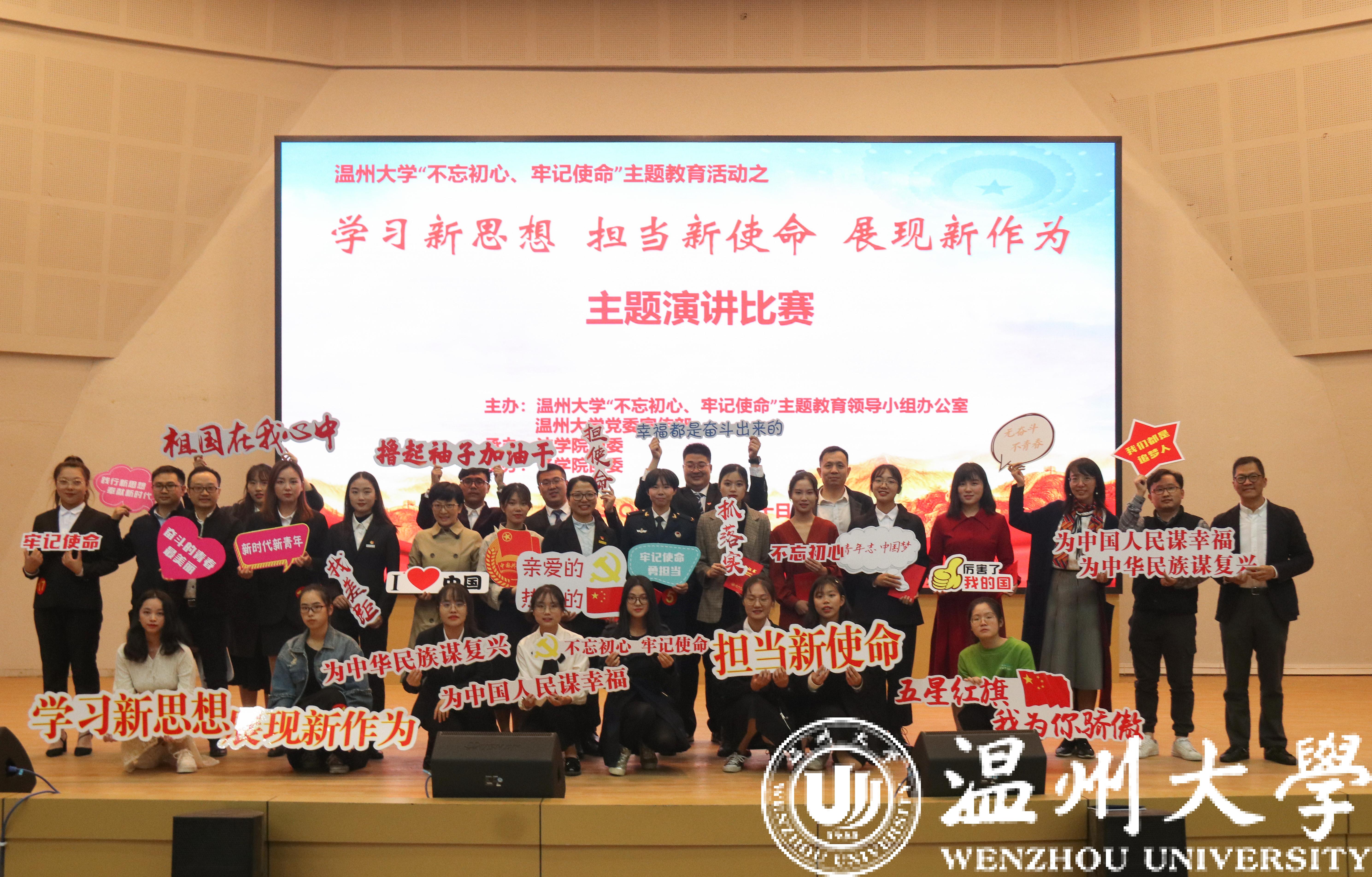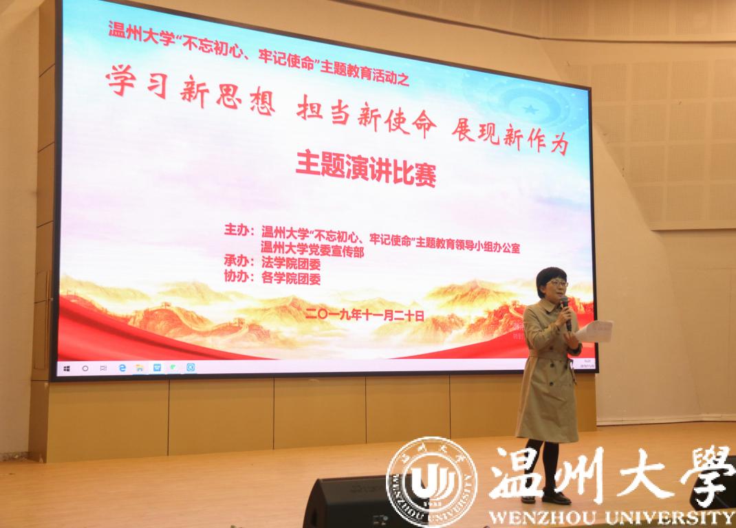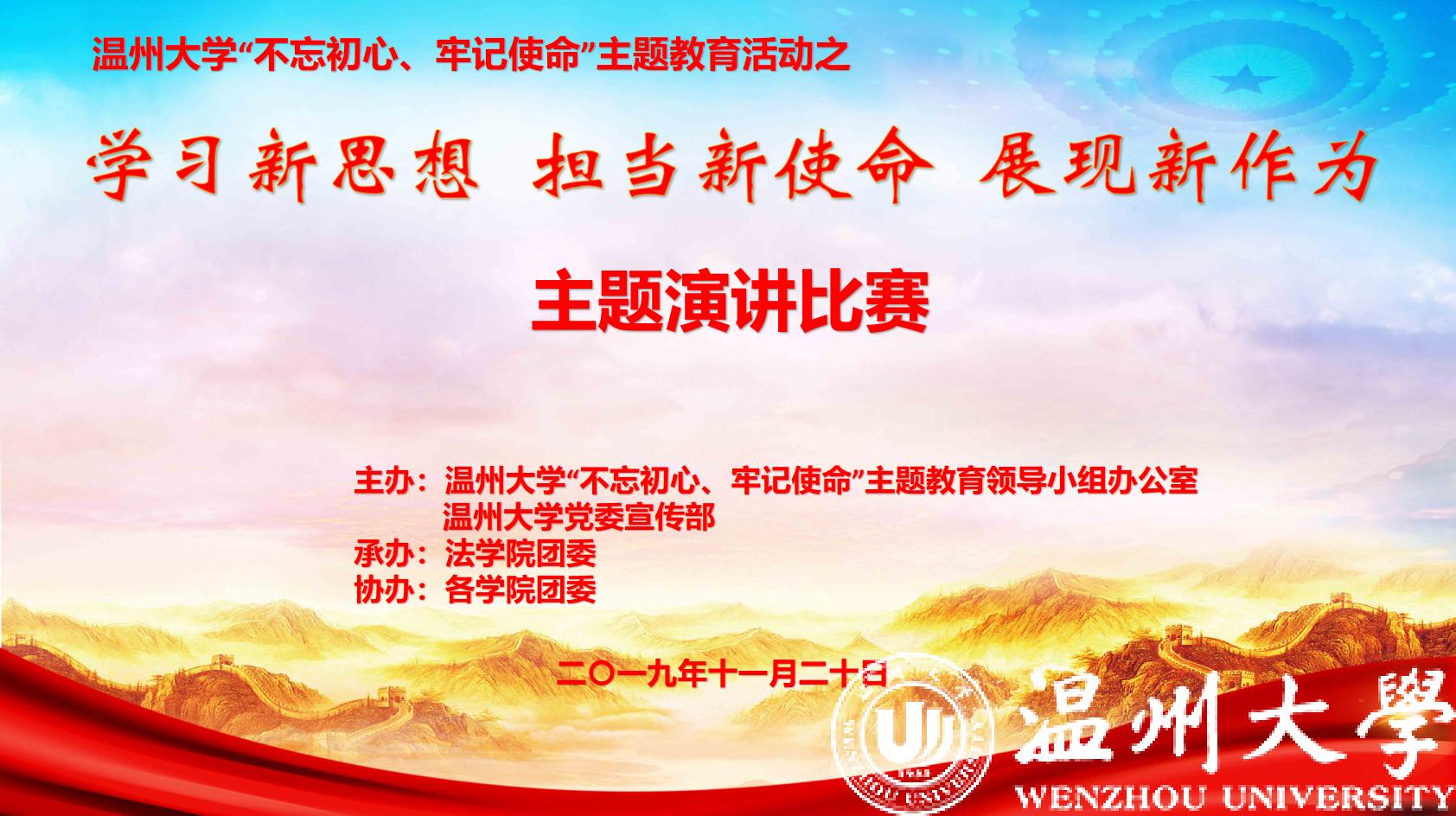 11月20日下午,由校党委“不忘初心、牢记使命”主题教育领导小组办公室、党委宣传部主办,麻将胡了试玩 团委承办、各麻将胡了试玩 团委协办的温州大学“不忘初心、牢记使命”主题教育之“学习新思想、担当新使命、展现新作为”主题演讲赛在南校区教育麻将胡了试玩 报告厅举行。校党委宣传部副部长潘从义、学生处副处长包含丽、国际教育麻将胡了试玩 党总支书记林爱菊、校团委副书记丁强、人事处王峰老师等出席并担任比赛评委。各麻将胡了试玩 学生党员与入党积极分子代表观看了比赛。比赛前期经各麻将胡了试玩 广泛发动,共推荐了43名研究生和本科生选手参赛。经过初赛的激烈角逐,最终22名优秀选手脱颖而出,进入最终的决赛。