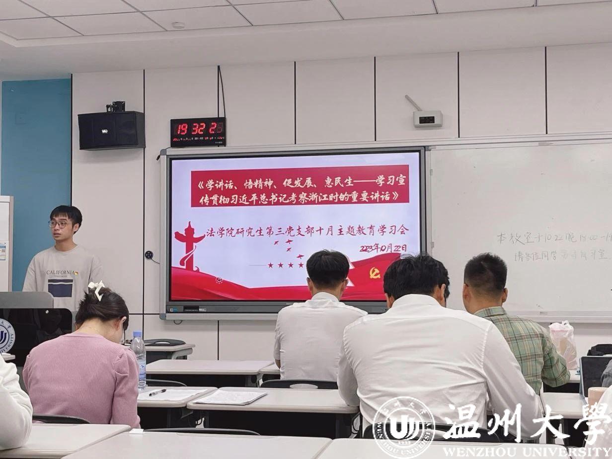 2023年10月22日晚,麻将胡了试玩 研究生第三党支部开展了“学讲话、悟精神、促发展、惠民生”主题党日活动,重点学习宣传贯彻习近平总书记考察浙江时的重要讲话。付玉霞、蒋元旦、项娉娉、周心钰、袁一函、葛康怡、张怡轩、王冠梅杰、莫友同志分别就“杭州亚运会开幕前夕,习近平赴浙江考察”“习近平总书记为浙江省改革发展作出的系列重要指示”“学好用好《习近平经济思想学习纲要》”三个主题进行了学习心得分享。