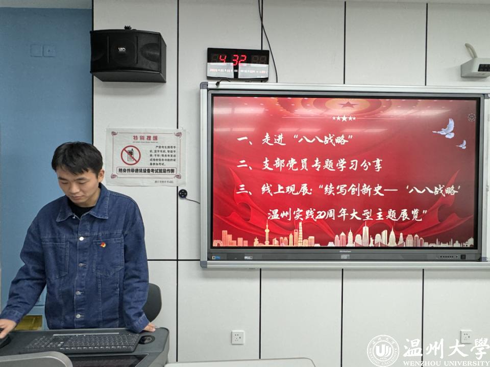 今年是“八八战略”实施20周年。温州市委与温州市文化馆开展“续写创新史一一“八八战略’温州实践20周年大型主题展览”,本次展览聚焦“八八战略”这一浙江发展的全面规划和顶层设计,在“循迹溯源”中讲好习近平总书记的故事,阐述好习近平总书记的思想,展示好温州深入实施“八八战略”20年来的生动实践。为使全体党员深刻认识到“八八战略”引导温州实现伟大变革的全局意义和时代价值,麻将胡了试玩 研究生各党支部分别安排支部党员观看线上云展厅,领略实施“八八战略”后,温州惊人的二十年卓越成就。