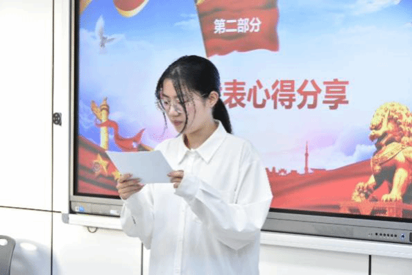 第二部分是党员代表分享学习心得,汪申涵同志和杜颖同志分别对学习内容发表了她们的见解,分享了在学习过程中的收获和感想。