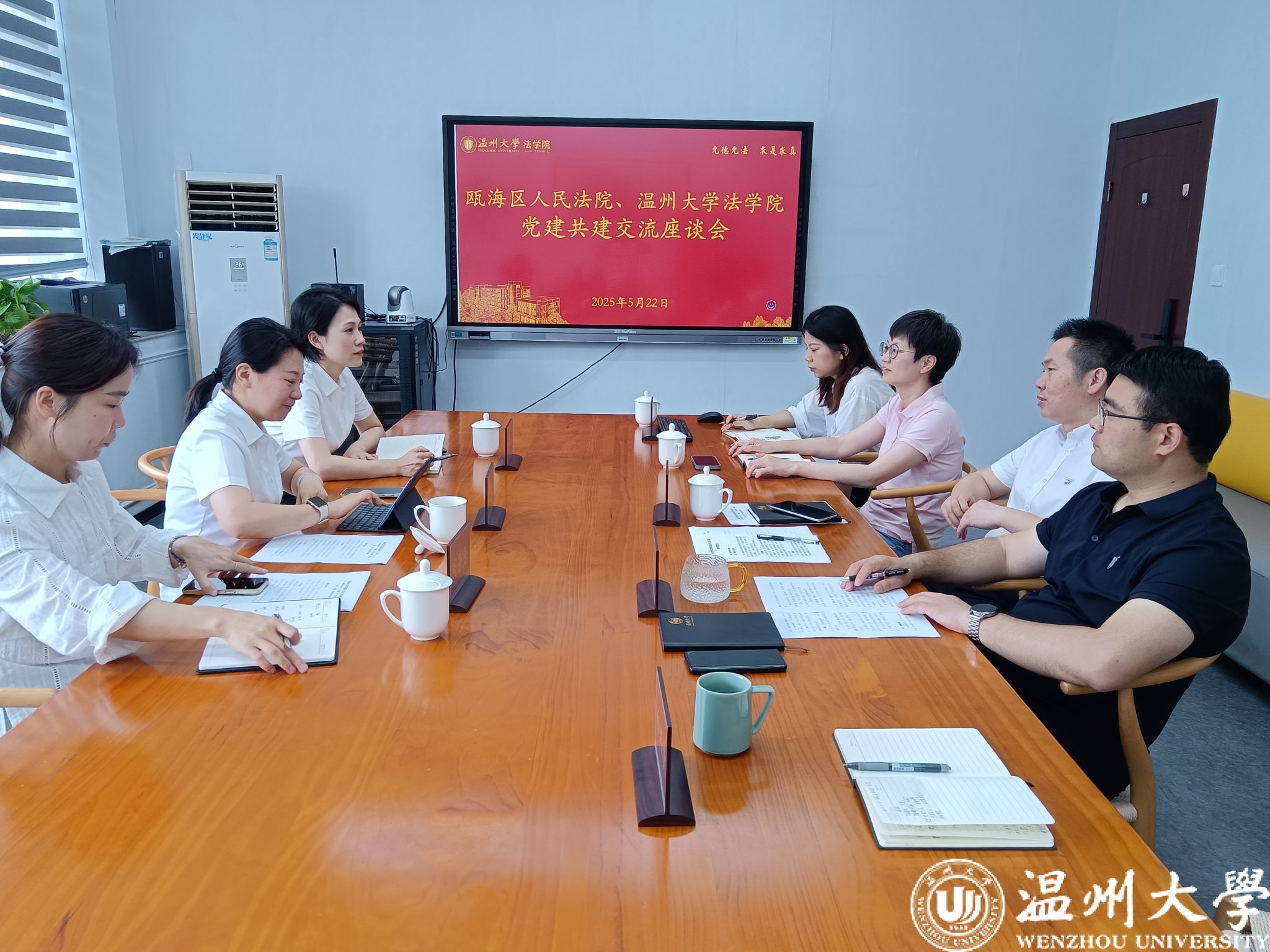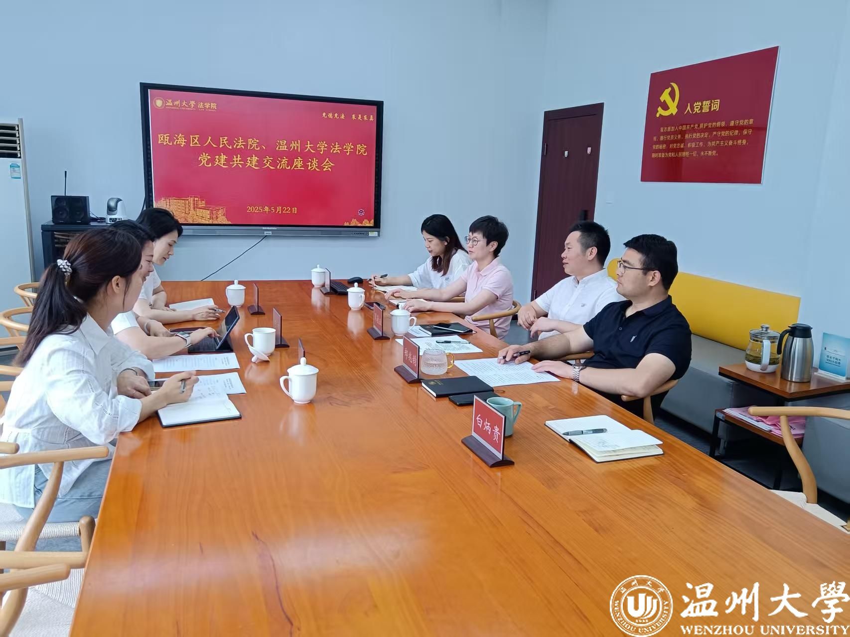 为深入学习贯彻党的二十届三中全会精神,深化党建引领作用,推动司法实践与法学教育深度融合,5月23日上午瓯海区人民法院政治部主任王克,仙岩人民法庭庭长王群英等一行来麻将胡了试玩 开展党建共建交流活动。麻将胡了试玩 党委书记周敬业、副院长周一颜、党委副书记郑兆钧等参加活动。