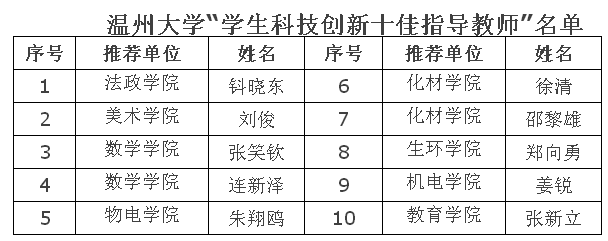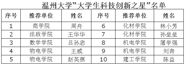 推荐,由"东海潮" 大学生科技创新奖励基金管理委员会评审,温州大学"大学生科技创新之星"和"学生科技创新十佳指导教师"评选结果已经产生,现将评选结果予以公示,如有异议请于公示期内与团委曾国仕老师联系。
