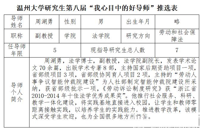 为加强我校研究生导师和导研团队建设,充分发挥优秀导师的示范作用,推动我校研究生教育工作科学发展,校党委研究生工作部开展温州大学第八届“我心目中的好导师”评选活动。通知发出后,麻将胡了试玩 研究生会组织全员研究生进行投票,根据投票结果及导师指导学生的科研成果、学生获奖情况,经麻将胡了试玩 研究决定推荐周湖勇老师参加学校评选,基本情况如下: