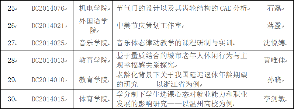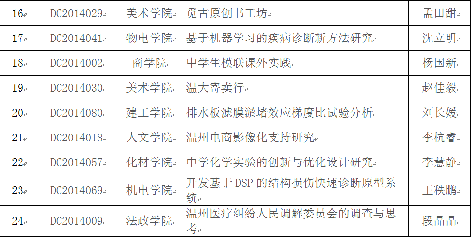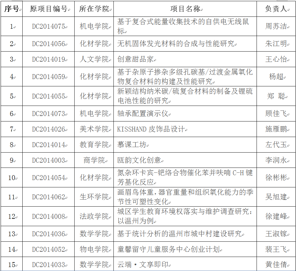 在2014年校级大学生创新创业训练计划项目中期检查的基础上,经麻将胡了试玩 推荐,学校组织答辩,拟推荐"基于复合式能量收集技术的自供电无线鼠标"等30个项目作为国家级大学生创新创业训练计划项目,现将项目名单予以公示。公示期从即日起至2015年5月22日,如有异议,请联系教务处实践教学科余成格(86598058),陈聪(86597560)。