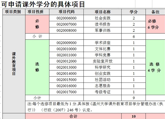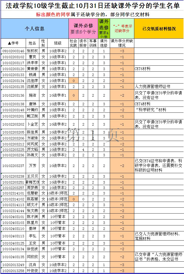 以下是到目前为止还缺课外学分、已交材料和未交材料的情况: