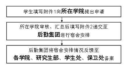 2.考虑到住宿管理、安全保障、后勤服务等因素,一般要求各申请人自行组合后以宿舍为单位进行申请。后勤集团根据每天每生2元的标准收取水电费等基本开支。