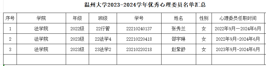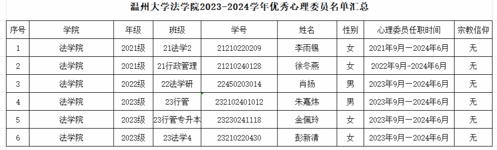 根据《关于开展温州大学2023-2024学年优秀心理委员评比活动的通知》文件,采取心理委员自主报名、麻将胡了试玩 审核,共评选出以下3位同学拟推荐为校级优秀心理委员,6位同学拟推荐为院级优秀心理委员。公示期:2023年6月17日—6月21日,如有异议请于公示期内联系谢老师(麻将胡了试玩 一楼事务大厅,电话:86680919)。