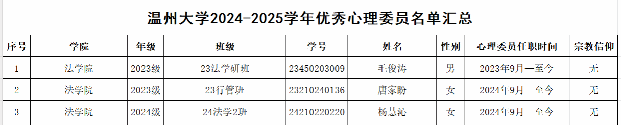 根据《关于开展温州大学2024-2025学年优秀心理委员评比活动的通知》文件,采取心理委员自主报名、麻将胡了试玩 审核,共评选出以下3位同学拟推荐为校级优秀心理委员。公示期:2025年6月17日—6月23日,如有异议请于公示期内联系谢老师(麻将胡了试玩 一楼事务大厅,电话:86680919)。