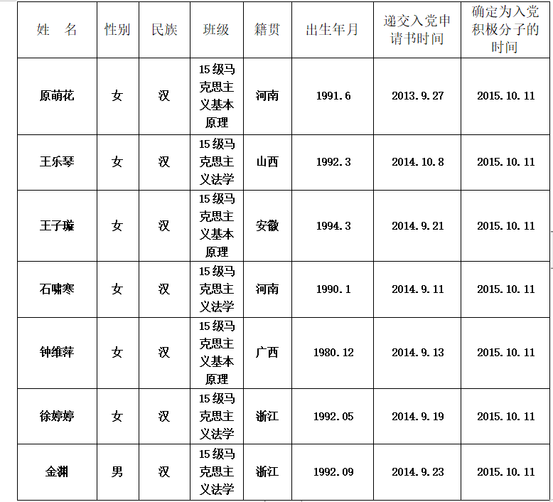 经中共温州大学法政麻将胡了试玩 研究生党支部培养考察,认为以下同志(具体名单附后)已基本具备中共预备党员条件,拟于近期发展,现予以公示。