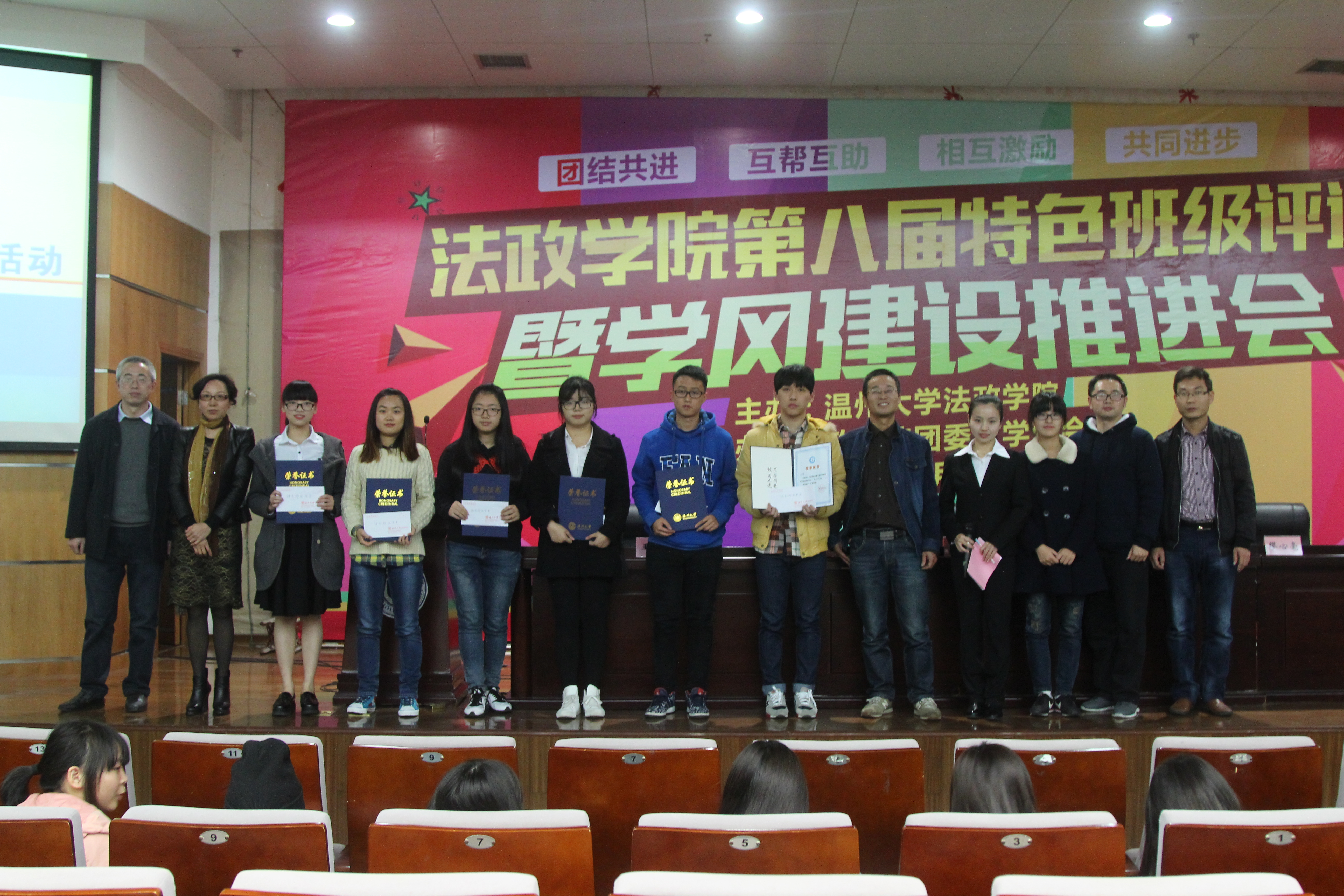 2015年12月2日下午,院学生科主办、院团委和学生会学习部具体承办的法政麻将胡了试玩 第八届特色班级评选暨学风建设推进会在育英大礼堂举行。法政麻将胡了试玩 院长王宗正、党总支书记林钦、党总支副书记严玲红和副院长王勇、缪心毫,学生科孙德升、白昌科老师,各班级班主任老师,院学生会主席团成员以及各参选班级的15名学生代表观摩并现场投票。评选大会由周斯拉同学主持。